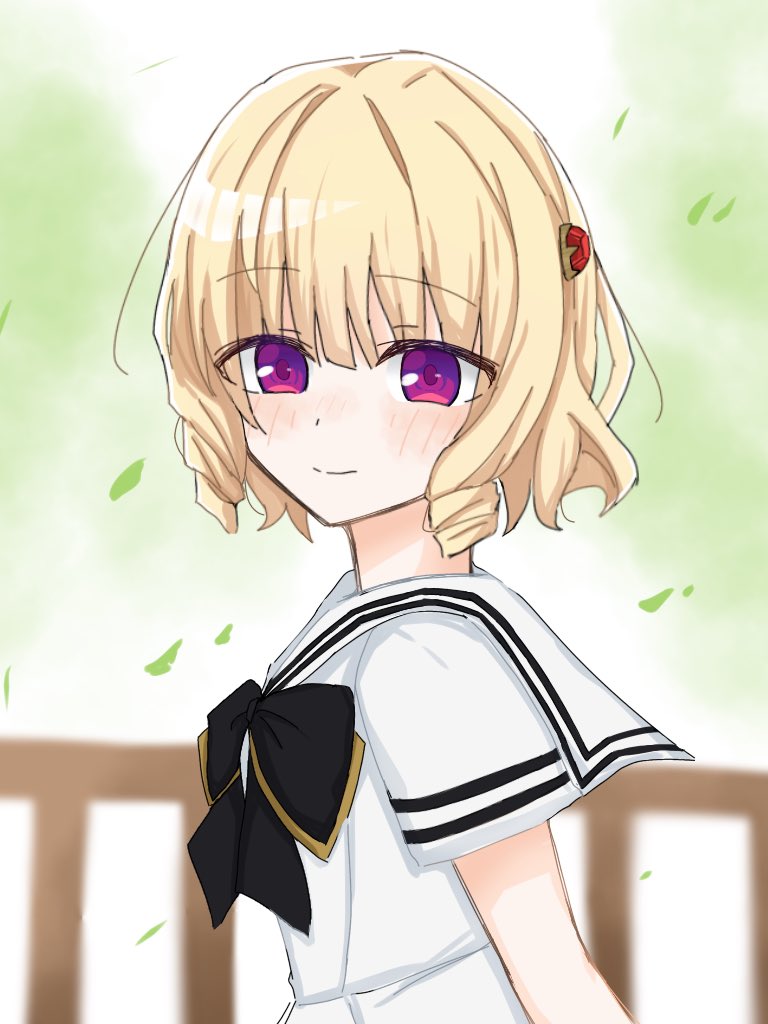 1girl arm_at_side assault_lily black_bow black_bowtie blonde_hair blurry blurry_background blush bow bowtie closed_mouth commentary day drill_hair drill_sidelocks falling_leaves from_side gem gem_hair_ornament imamura_yukari_(assault_lily) leaf looking_at_viewer looking_to_the_side official_alternate_costume outdoors purple_eyes railing red_gem sailor_collar sana_(hs_yp1) school_uniform serafuku shirt short_hair short_sleeves sidelocks smile solo upper_body white_sailor_collar white_shirt