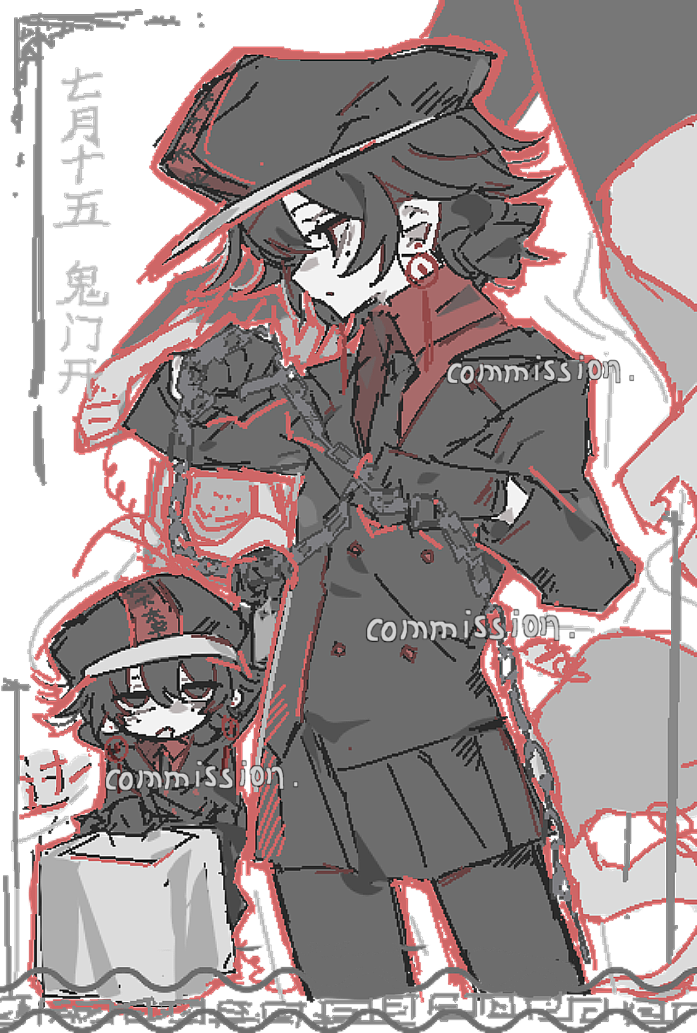 1girl black_eyes black_gloves black_hair black_hat black_jacket black_necktie black_pantyhose black_skirt buttons chain chibi chinese_commentary chinese_text closed_mouth collared_shirt colored_skin commentary_request commission double-breasted earrings gloves hair_between_eyes hat highres holding holding_chain jacket jewelry li_yuting_(female) long_sleeves miniskirt mole mole_under_each_eye mole_under_eye multiple_moles multiple_views necktie open_mouth pantyhose pleated_skirt qiufu_1.0 red_shirt shirt short_hair skirt touqi_guaitan watermark white_skin