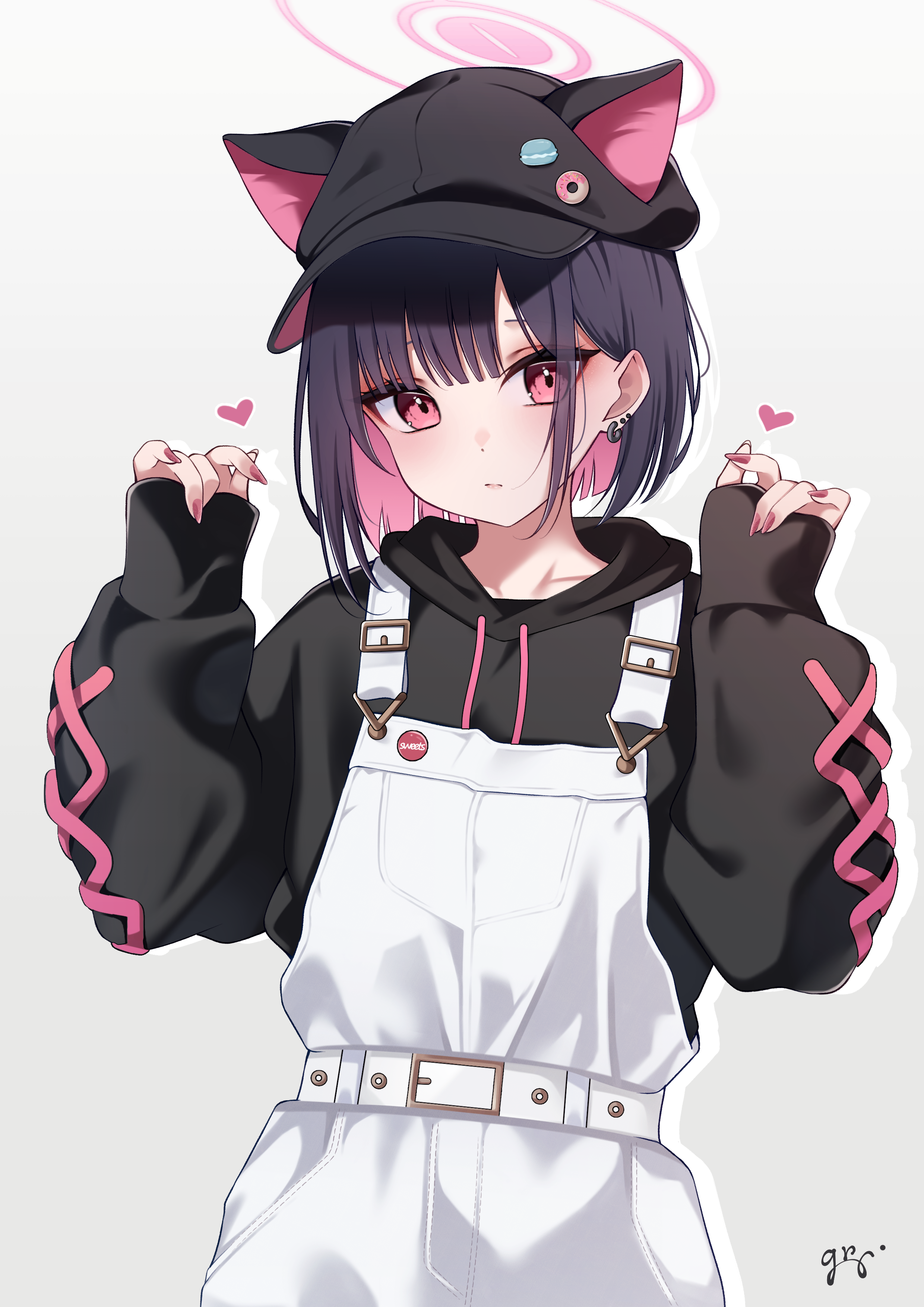 1girl absurdres animal_ears belt black_hair black_hoodie blue_archive newsboy_cap cat_ears cat_girl colored_inner_hair commentary drawstring ears_through_headwear guri_(gri1211) halo hands_up hat heart highres hood hood_down hoodie kazusa_(blue_archive) long_sleeves looking_at_viewer multicolored_hair overalls pink_eyes pink_hair pink_halo puffy_long_sleeves puffy_sleeves signature simple_background solo upper_body white_background white_belt white_overalls