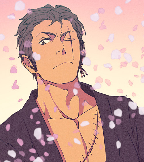 1boy asukasuka closed_mouth commentary_request earrings falling_petals gradient_background japanese_clothes jewelry kimono looking_to_the_side male_focus one_piece petals pink_petals roronoa_zoro scar scar_across_eye scar_on_face short_hair sideburns solo stitched_torso stitches upper_body