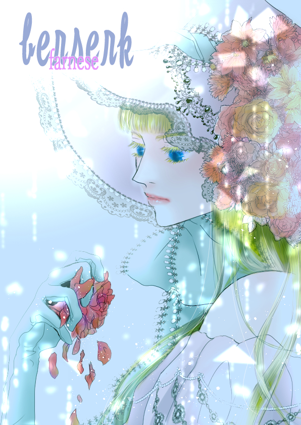 1girl berserk blonde_hair blue_eyes blunt_bangs character_name closed_mouth colored_eyelashes commentary_request copyright_name dress expressionless farnese_(berserk) gloves hat holding holding_petal kame_(jeycobsry) long_hair petals pink_lips profile solo upper_body white_dress white_gloves white_hat