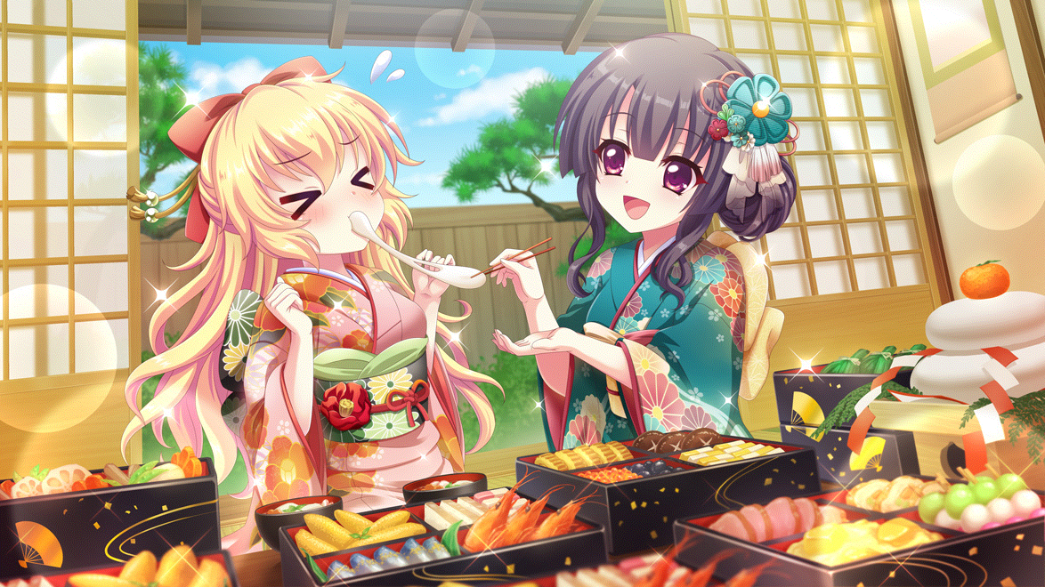 >_< 2girls :d architecture bento black_hair blonde_hair blue_sky blurry blurry_foreground blush bow breasts bush chopsticks closed_eyes cloud dango day dot_nose dutch_angle east_asian_architecture eating fan_print feeding fence film_grain floral_print floral_print_kimono flying_sweatdrops food food_request fruit game_cg green_kimono hair_bow hair_bun hair_ornament hair_up hands_up hanging_scroll hasegawa_mii holding holding_chopsticks ichikishima_mizuha indoors izumi_tsubasu japanese_clothes kimono lens_flare long_hair mandarin_orange meat mochi multiple_girls new_year non-web_source obi official_art open_mouth pink_kimono print_kimono print_sash purple_eyes re:stage! red_bow sanshoku_dango sash scroll self-datamine short_hair shouji shrimp sidelocks single_hair_bun sky sliding_doors small_breasts smile sparkle tree wagashi wooden_fence yukata