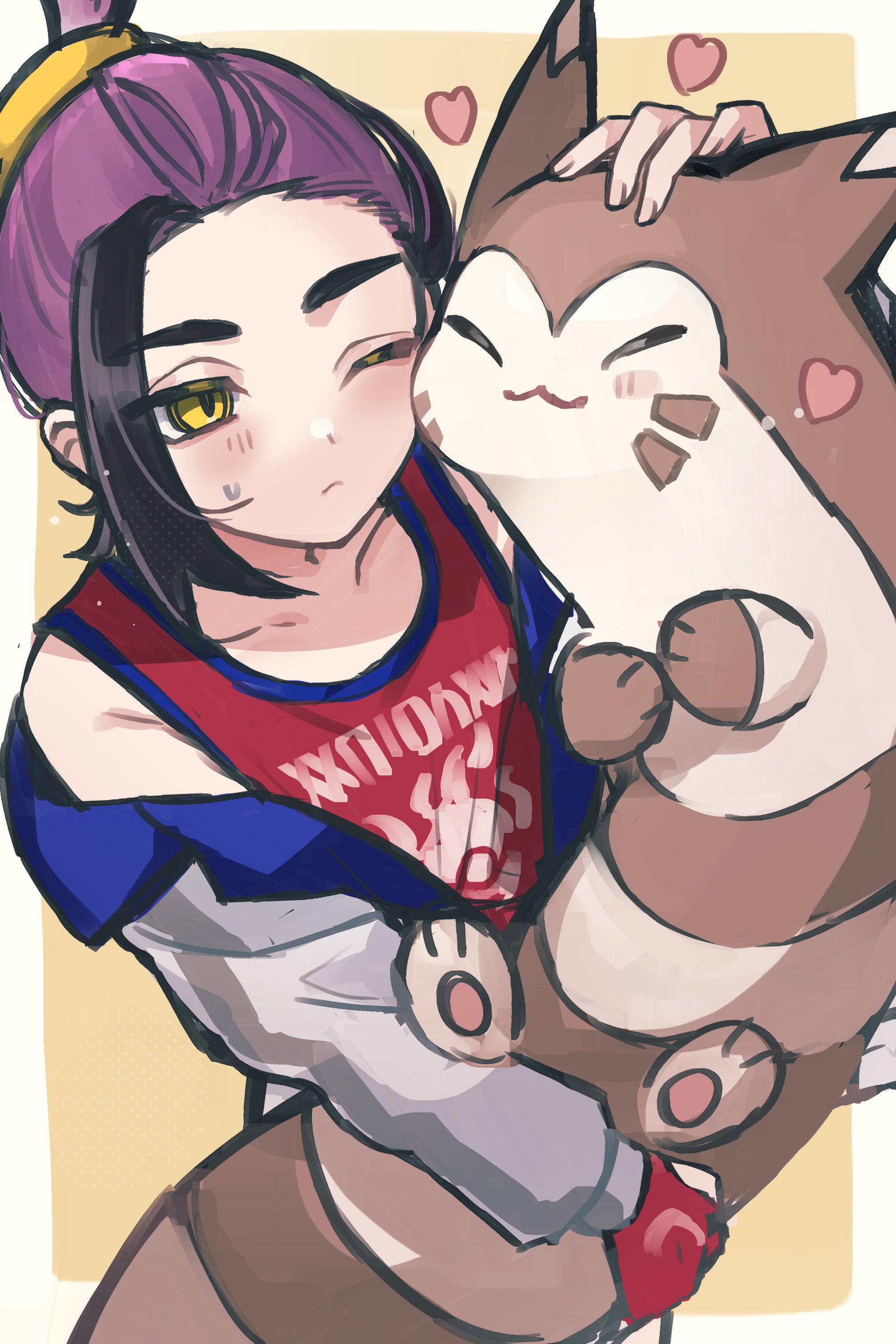 1boy :3 absurdres black_hair blush closed_eyes closed_mouth commentary_request furret gen_2_pokemon gloves heart highres holding holding_pokemon jacket kieran_(pokemon) long_sleeves male_focus mta2ep nintendo off_shoulder one_eye_closed partially_fingerless_gloves pokemon pokemon_(creature) pokemon_scarlet_and_violet purple_hair red_gloves red_tank_top simple_background single_glove sweat tank_top two-tone_background yellow_eyes