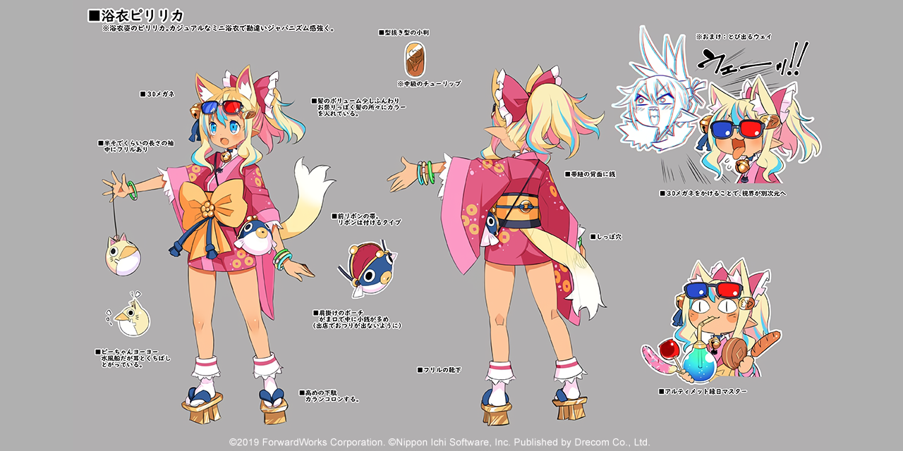 1boy 1girl 3d_glasses animal_ear_fluff animal_ears back bell bendy_straw blonde_hair blue-tinted_eyewear blue_hair bracelet reference_sheet coin concept_art copyright_name disgaea disgaea_rpg dog_ears dog_girl dog_tail drink drinking drinking_straw full_body gold grey_background highleg japanese_clothes jewelry kimono koban_(gold) long_hair long_sleeves makai_senki_disgaea_7 multicolored_hair multiple_views neck_bell non-web_source obi official_art open_mouth outstretched_arm photoshop_(medium) pink_hair pirilika_(disgaea) platform_footwear pointy_ears red-tinted_eyewear sandals sash simple_background solo_focus standing streaked_hair sunglasses tail text_focus tinted_eyewear tongue tongue_out turnaround wide_sleeves edogawa_yeyasu yukata