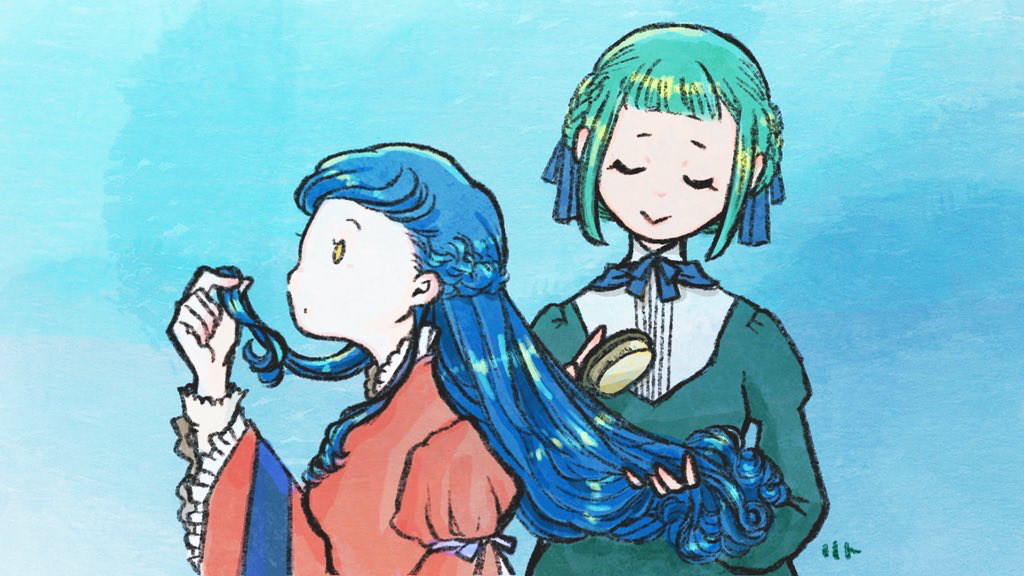 2girls :> blue_background blue_hair blue_ribbon braid brushing_another's_hair brushing_hair closed_eyes dress green_dress green_hair hair_brush holding holding_hair_brush honzuki_no_gekokujou lieseleta_(honzuki_no_gekokujou) ling_samsam long_hair long_sleeves multiple_girls myne_(honzuki_no_gekokujou) red_dress ribbon short_hair twirling_hair yellow_eyes