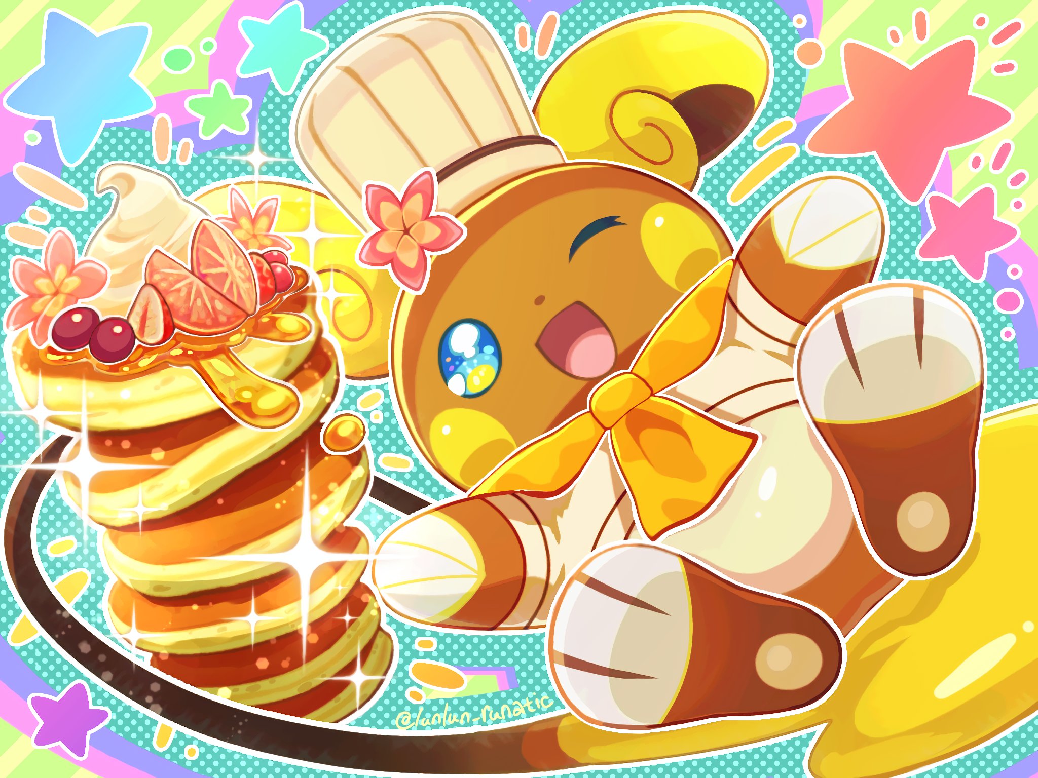 alolan_form alolan_raichu alolan_raichu_(pancake_chef) animal_focus blue_eyes chef_hat flower food gen_7_pokemon hat highres nintendo no_humans one_eye_closed open_mouth pancake pokemon pokemon_(creature) pokemon_cafe_remix runachikku smile whipped_cream wink