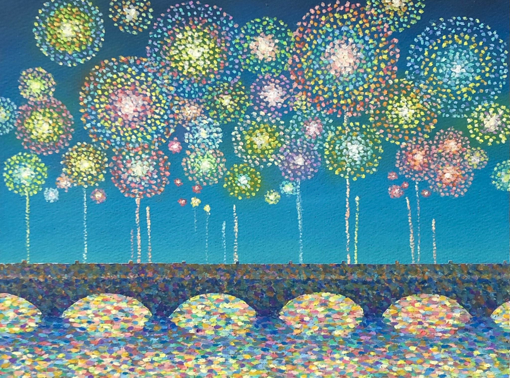 aerial_fireworks arch_bridge bridge fireworks highres keitatsujia night no_humans original painting_(medium) scenery shadow sky traditional_media water