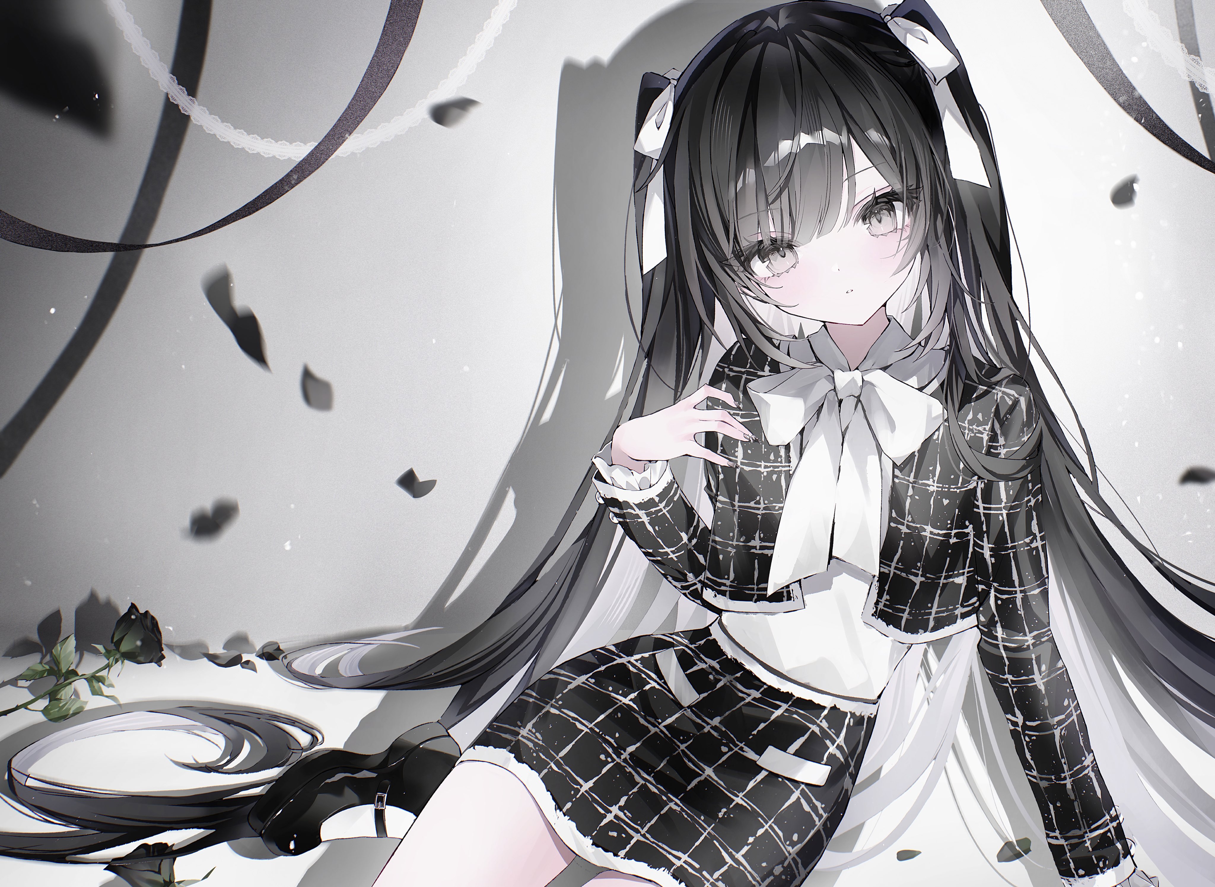 1girl absurdres black_eyes black_flower black_hair black_jacket black_nails black_rose black_shoes black_skirt blush checkered_clothes checkered_jacket checkered_skirt cropped_jacket flower frills head_tilt highres jacket long_hair long_sleeves looking_at_viewer mary_janes neck_ribbon noah_(0noah) original ribbon rose shirt shoes sitting skirt socks solo twintails very_long_hair white_ribbon white_shirt white_socks yokozuwari