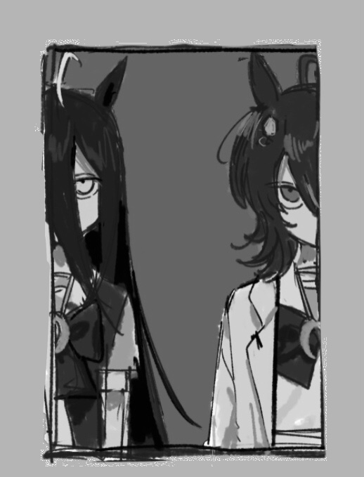 2girls agnes_tachyon_(umamusume) animal_ears chemical_structure coat collared_coat earrings greyscale hair_between_eyes horse_ears horse_girl jewelry lab_coat long_bangs long_hair_between_eyes looking_at_viewer manhattan_cafe_(umamusume) monochrome multiple_girls open_clothes open_coat saezurippp sailor_collar sailor_shirt school_uniform shirt short_sleeves single_earring staring tracen_school_uniform umamusume