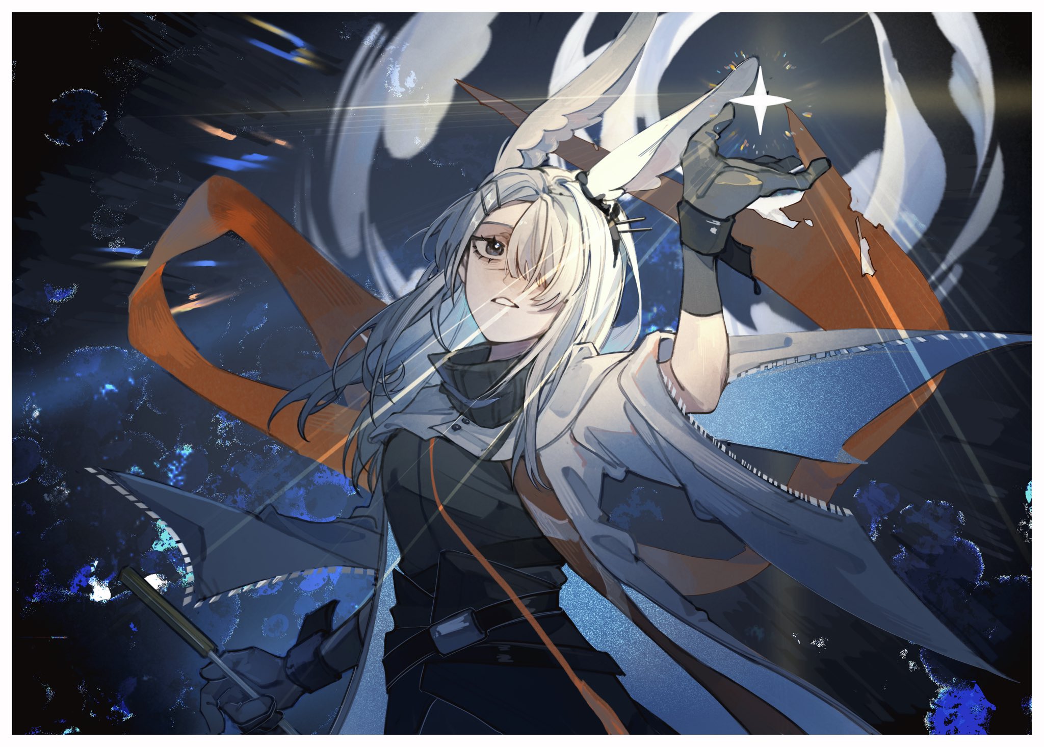 1girl arknights black_background black_dress black_gloves border breasts bright_pupils chinese_commentary cloak commentary_request dress frostnova_(arknights) gloves grey_eyes hair_over_one_eye hand_up highres medium_breasts multicolored_background orange_scarf resul_(scripppppp) scar scar_on_face scar_on_nose scarf solo star_(symbol) upper_body white_cloak white_hair white_pupils