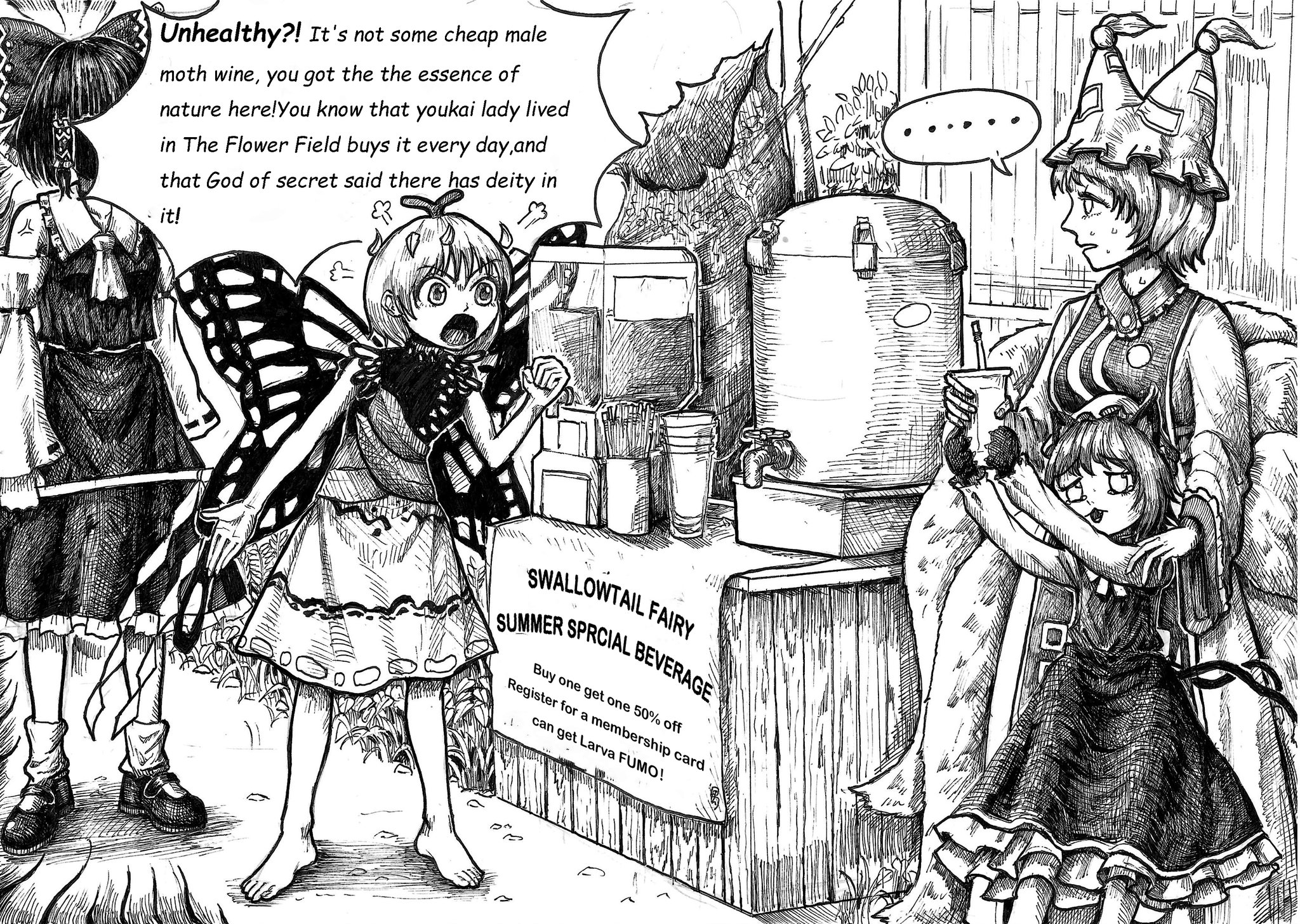 ... 4girls animal_ears antennae ascot barefoot bow butterfly_wings cat_ears cat_girl chen cup detached_sleeves dress english_text engrish_text eternity_larva fox_tail greyscale hair_bow hakurei_reimu hashtag-only_commentary hat highres holding holding_cup insect_wings mob_cap monochrome multiple_girls multiple_tails puff_of_air ranguage shoes short_hair skirt spoken_ellipsis standing tabard tail touhou useless-husky wings yakumo_ran