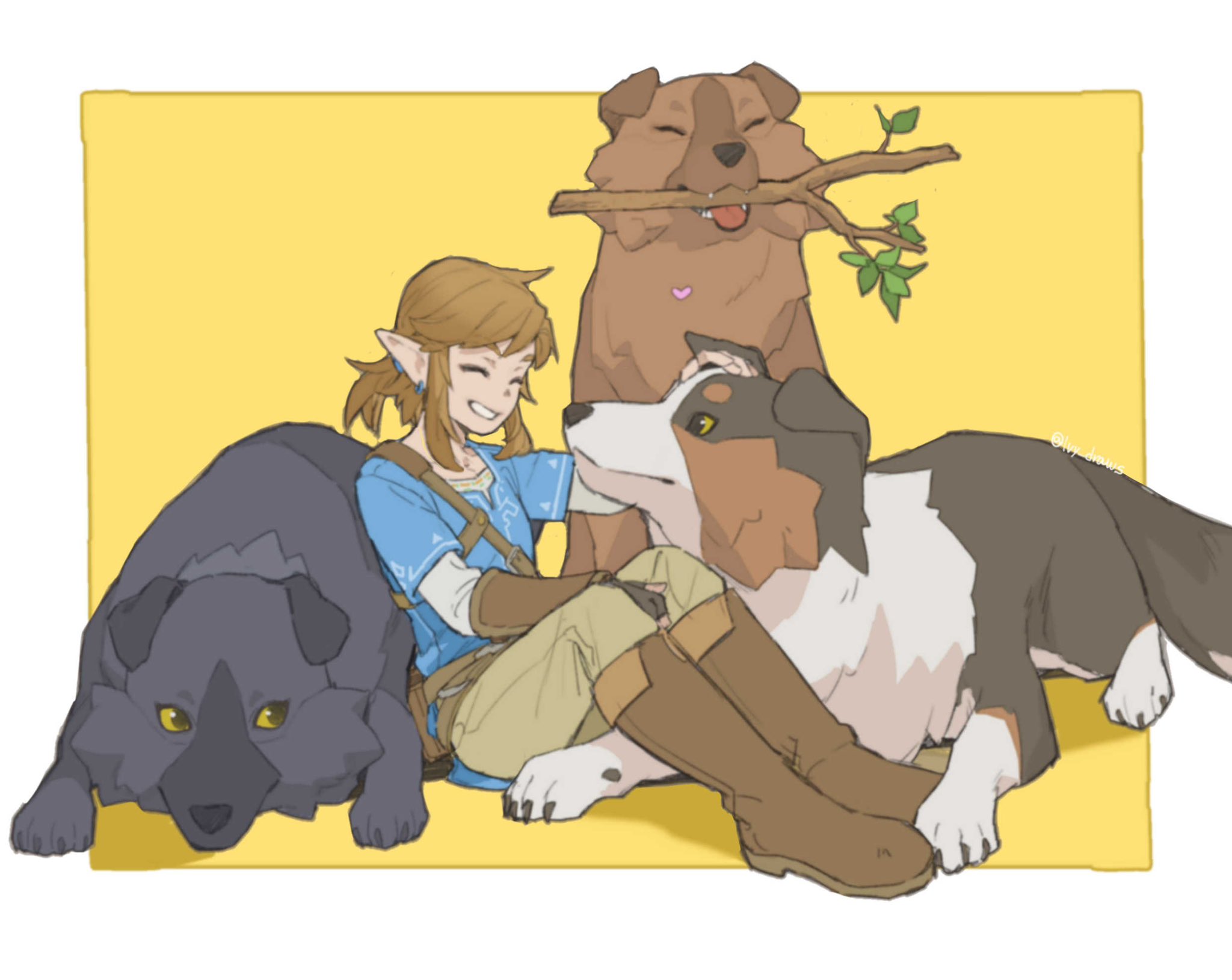 1boy animal blue_shirt boots brown_footwear brown_pants closed_eyes dog earrings fingerless_gloves gloves grin highres ivy_(sena0119) jewelry knee_boots link looking_at_animal male_focus nintendo pants pointy_ears shirt short_sleeves smile stick teeth the_legend_of_zelda the_legend_of_zelda:_breath_of_the_wild white_background yellow_background