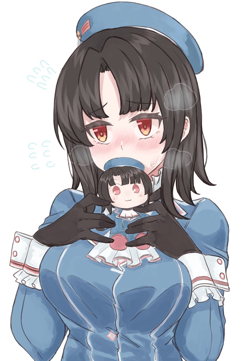 1girl ascot azumaya_toride beret black_gloves black_hair blue_hat blue_jacket blush breasts breath character_doll doll embarrassed gloves hat highres jacket kantai_collection large_breasts looking_at_viewer military military_uniform red_eyes short_hair spoken_sweatdrop sweatdrop takao_(kancolle) upper_body white_background