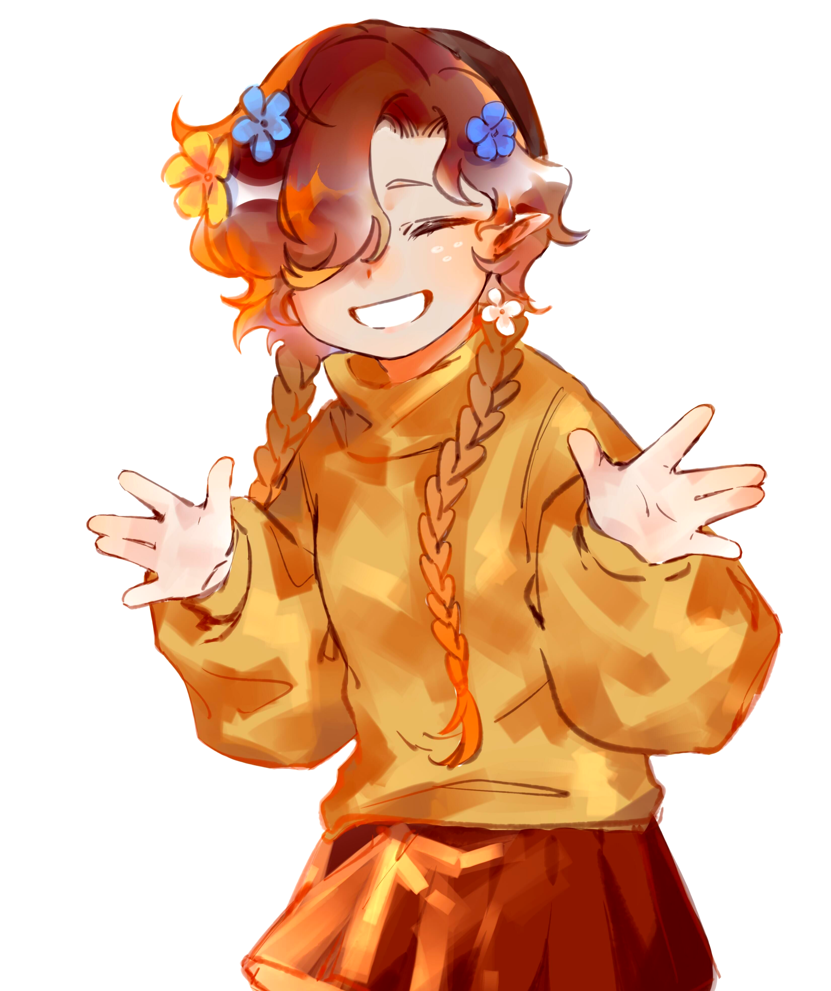 1girl absurdres anubis85816 braid brown_hair closed_eyes commentary english_commentary flower freckles grin hair_flower hair_ornament highres long_hair minecraft_youtube personification pointy_ears quackity_smp red_skirt skirt smile solo sweater tallulah_(old_design)_(quackity_smp) tallulah_(quackity_smp) twin_braids white_background yellow_sweater