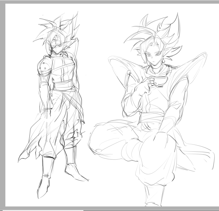 1boy alternate_costume art_program_in_frame bodysuit boots bracer cup dragon_ball dragon_ball_heroes dragon_ball_super earrings fused_zamasu greyscale hand_on_own_knee holding holding_cup jewelry jiajiajiajiaa long_sleeves monochrome multiple_views official_alternate_costume one_eye_covered pants bikini_armor pointy_ears potara_earrings sash sitting sketch spiked_hair teacup torn_clothes white_background