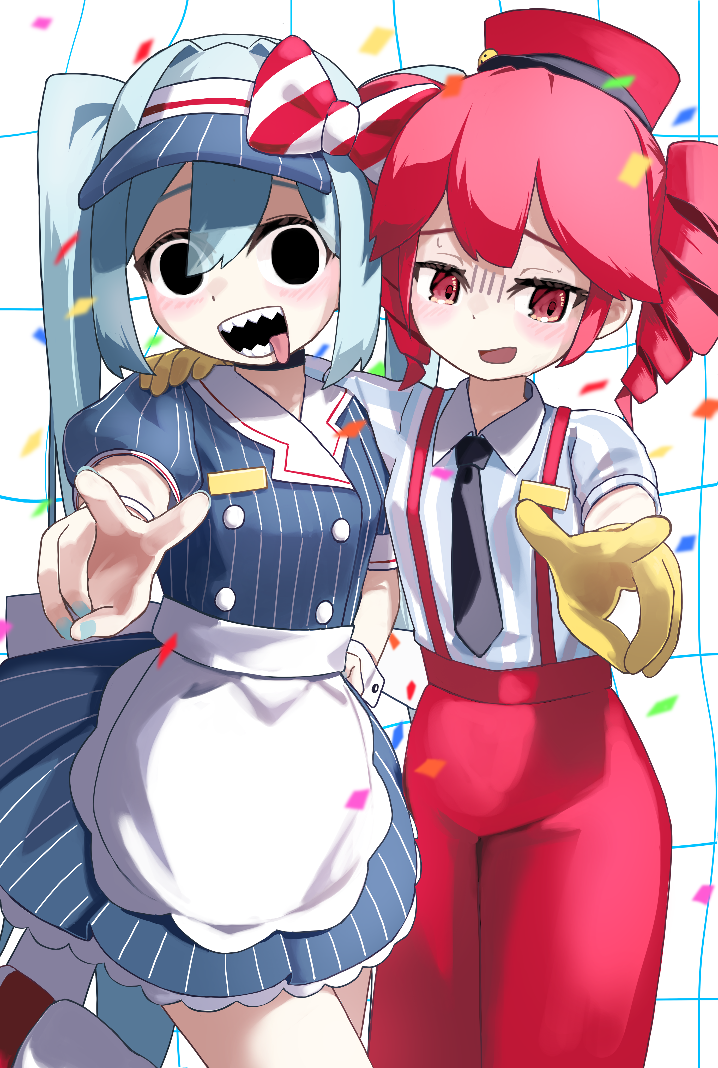 2girls absurdres apron aqua_hair aqua_nails black_necktie blue_dress buttons commentary double-breasted dress drill_hair gloves grid_background hand_on_another's_shoulder hand_on_own_hip hat hatsune_miku highres kasane_teto kasane_teto_(sv) long_hair looking_at_viewer looking_to_the_side mesmerizer_(vocaloid) multiple_girls nail_polish necktie open_mouth pants pointing pointing_at_viewer red_eyes red_hair red_hat red_pants satou_(www_nemu) sharp_teeth shirt solid_circle_eyes standing striped_clothes striped_dress striped_headwear suspenders synthesizer_v teeth tongue tongue_out twin_drills twintails utau v visor_cap vocaloid waitress white_apron white_shirt white_wrist_cuffs wrist_cuffs yellow_gloves
