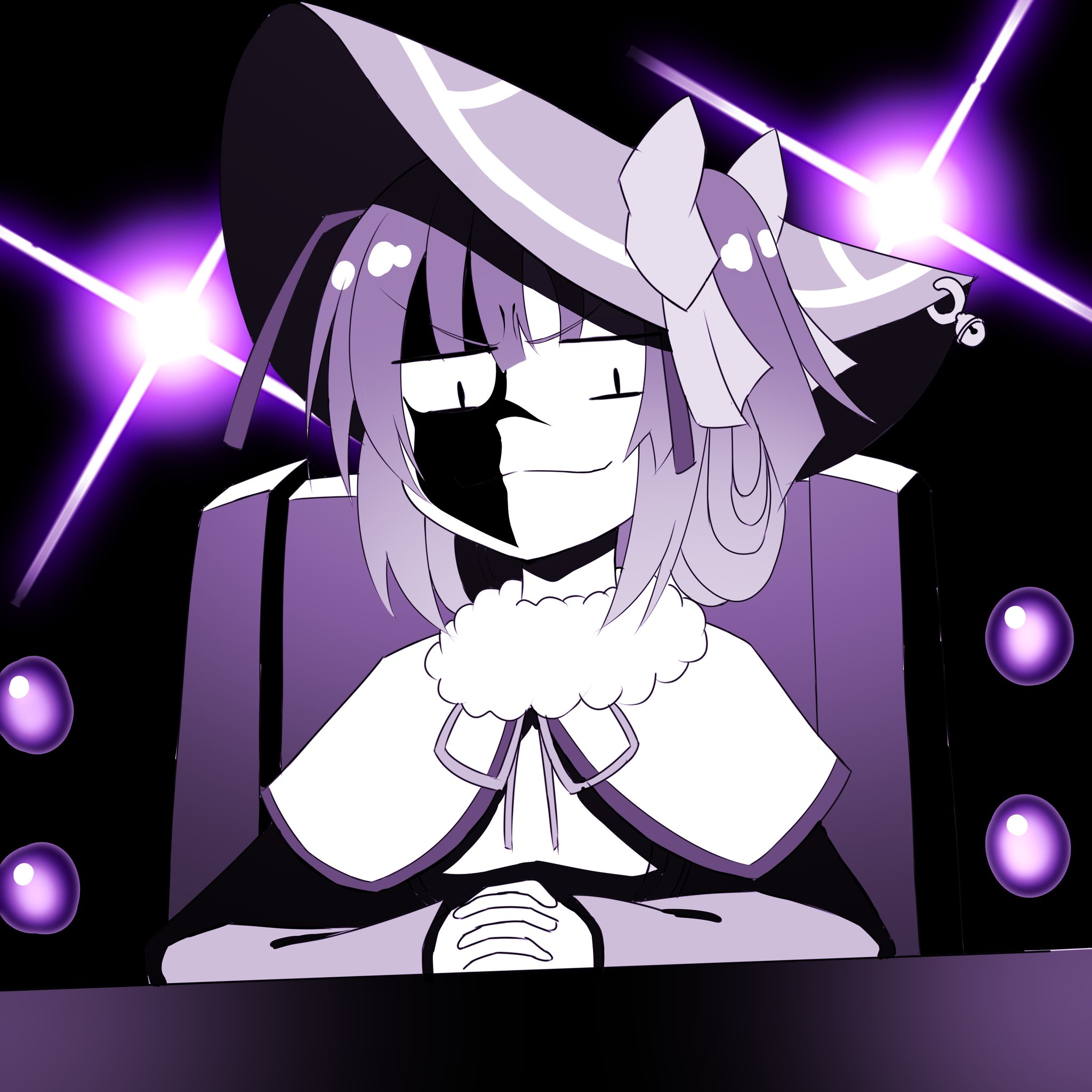 1girl antennae arthropod_girl backlighting bee_girl bell capelet chair closed_mouth commentary_request evil_grin evil_smile folded_ponytail fur_collar grin hachisuka_masatsune_(tenka_hyakken) highres insect_girl interlocked_fingers iwarihhi long_sleeves on_chair purple_theme ribbon shaded_face side_ponytail sidelocks smile solo sparkle tenka_hyakken torioigasa v-shaped_eyebrows