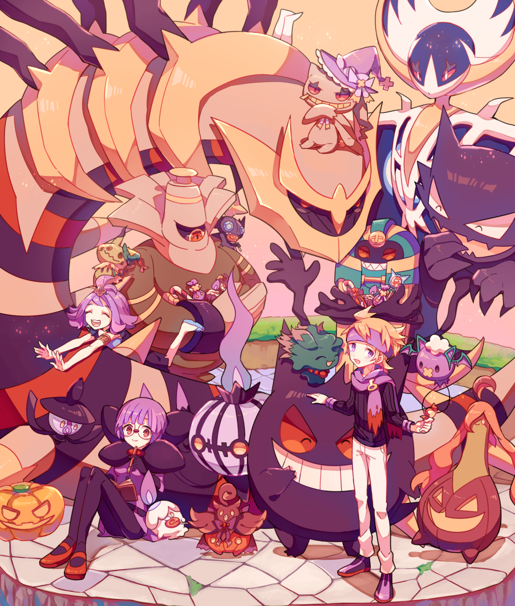 acerola_(pokemon) banette black_pantyhose blonde_hair candy cofagrigus cosplay dress drifloon dusknoir food gen_1_pokemon gen_2_pokemon gen_3_pokemon gen_4_pokemon gen_5_pokemon gen_6_pokemon gen_7_pokemon gengar giratina glasses gourgeist grin hat headband highres jack-o'-lantern lampent laughing legendary_pokemon litwick long_sleeves lunala mary_janes mimikaki misdreavus morty_(pokemon) nagatsukiariake nintendo pants pantyhose pokemon pokemon_(creature) pokemon_black_and_white pokemon_heartgold_and_soulsilver pokemon_sun_and_moon pumpkaboo purple_dress purple_eyes purple_hair purple_headband purple_scarf red_footwear round_eyewear sableye scarf shauntal_(pokemon) shoes short_hair sitting smile white_pants witch_hat wrapped_candy zubat zubat_(cosplay)