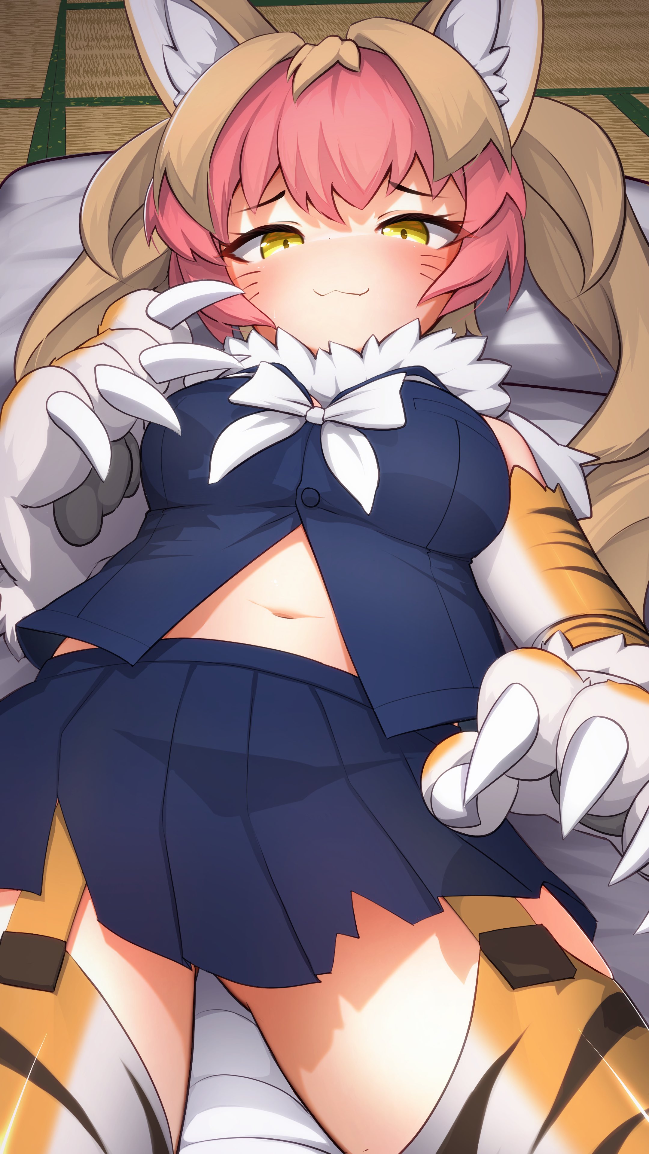 1girl :3 absurdres animal_print bare_shoulders blue_shirt blue_skirt bow bowtie brown_hair elbow_gloves facial_mark fur_collar garter_straps gloves highres karekusa_meronu kemono_friends looking_at_viewer lying midriff_peek multicolored_hair navel nue_(kemono_friends) on_back pink_hair pleated_skirt print_gloves print_thighhighs school_uniform serafuku shirt skirt sleeveless solo thighhighs tiger_print twintails two-tone_hair whisker_markings white_bow white_bowtie white_fur yellow_eyes zettai_ryouiki