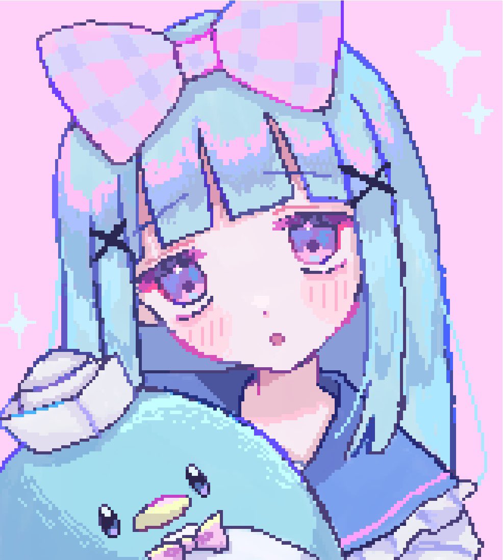 1girl :o blue_hair blue_sailor_collar blunt_bangs blush bow commentary_request frilled_sailor_collar frills hair_bow hair_ornament hat head_tilt jitome long_hair looking_up open_mouth original pink_background pink_bow pixel_art plaid_bow portrait purple_eyes sailor_collar sailor_hat shirt shizumu_(shi_zumu) simple_background solo sparkle stuffed_animal stuffed_penguin stuffed_toy white_hat white_shirt x_hair_ornament