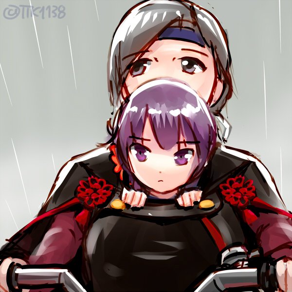 2girls akebono_(kancolle) artist_name asymmetrical_hair bicycle chitose_(kancolle) flower grey_eyes grey_hair hair_ornament headband kantai_collection multiple_girls purple_eyes purple_hair rain raincoat riding riding_bicycle tassel ttk1138