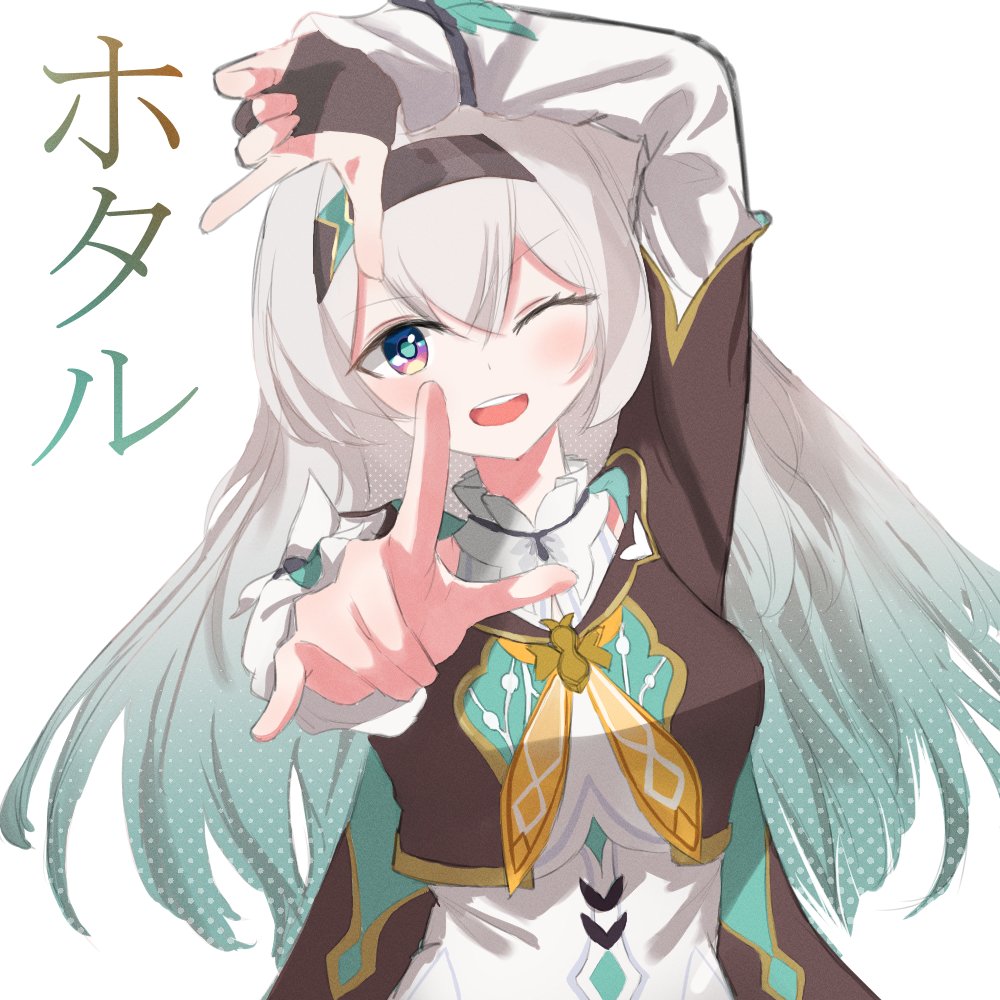 1girl ;d arm_up auxuelus black_gloves black_hairband breasts cropped_jacket firefly_(honkai:_star_rail) frilled_sleeves frills gloves grey_hair hair_between_eyes hair_intakes hairband honkai:_star_rail honkai_(series) long_hair long_sleeves looking_at_viewer medium_breasts multicolored_eyes necktie one_eye_closed open_mouth orange_necktie partially_fingerless_gloves pointing pointing_at_viewer smile two-tone_eyes upper_body white_background