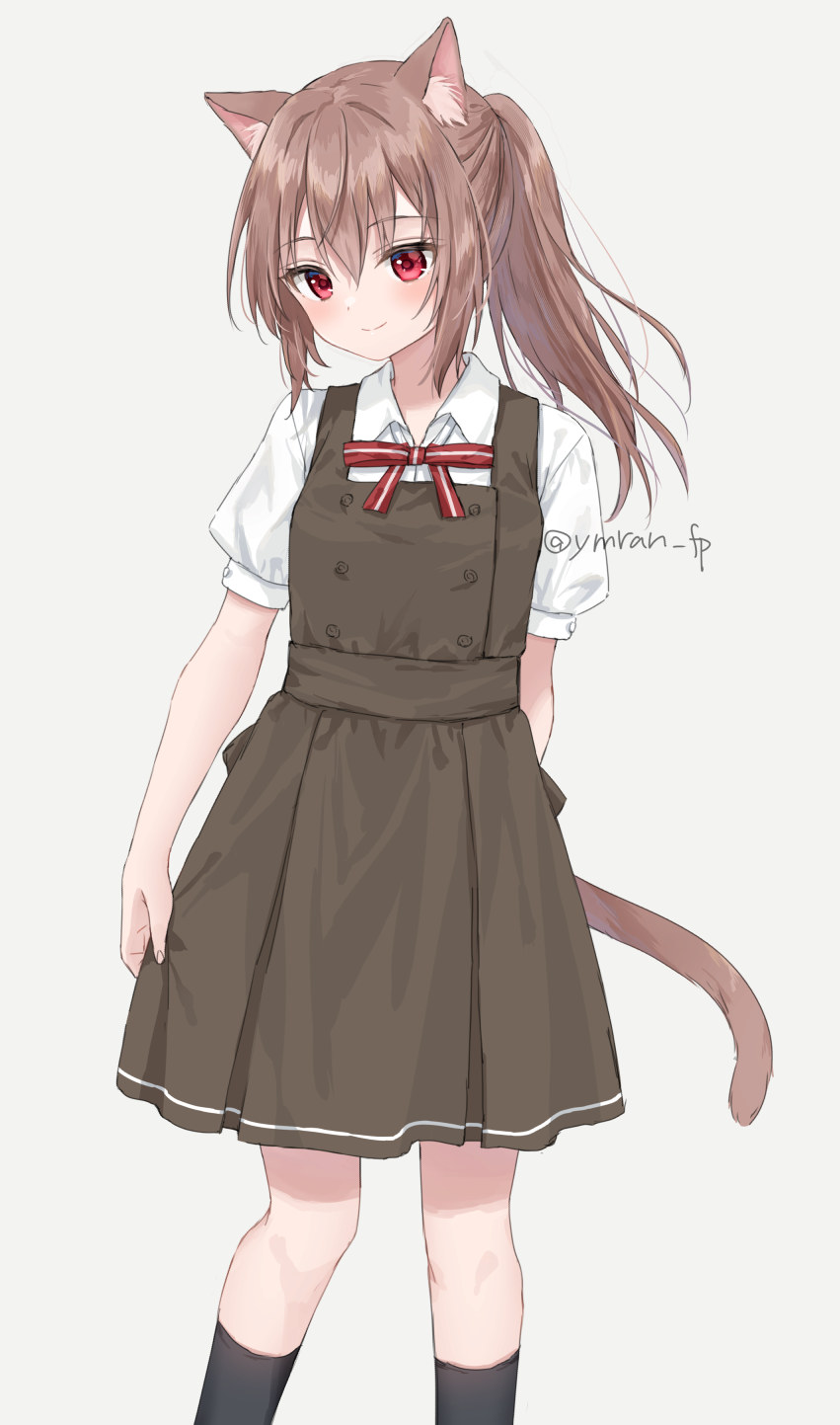 1girl animal_ear_fluff animal_ears black_socks blush bow brown_dress brown_hair cat_ears cat_girl cat_tail closed_mouth collared_shirt commentary_request dress dress_shirt feet_out_of_frame flat_chest grey_background hair_between_eyes highres looking_at_viewer nina_(yumoran) original pinafore_dress ponytail red_bow red_eyes shirt simple_background sleeveless sleeveless_dress smile socks solo standing tail twitter_username white_shirt yumoran