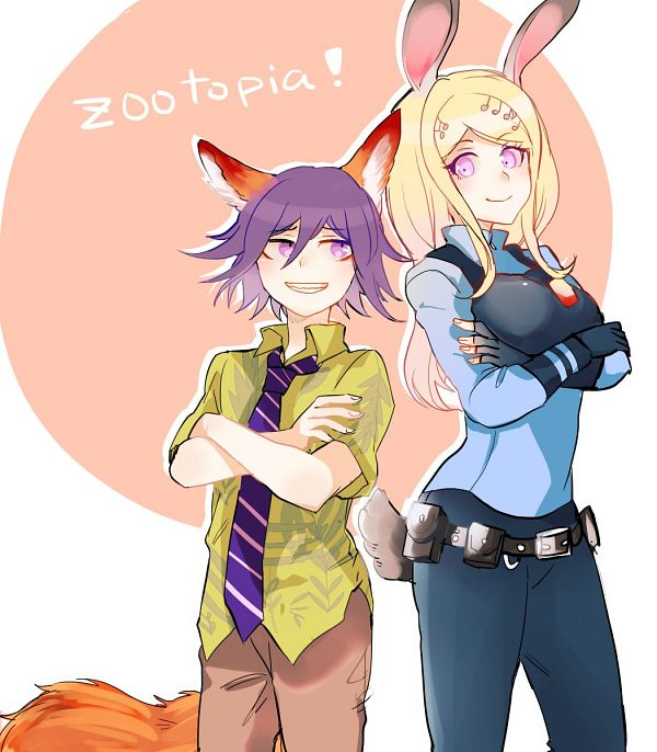 1boy 1girl akamatsu_kaede animal_ears belt black_belt black_gloves black_pants blonde_hair breasts brown_background brown_pants cosplay danganronpa_(series) danganronpa_v3:_killing_harmony fingerless_gloves fortissimo fox_boy fox_ears fox_tail gloves green_shirt grin hair_ornament judy_hopps judy_hopps_(cosplay) large_breasts leaf_print long_hair musical_note musical_note_hair_ornament nagi_ceo_(n4gi_kv) necktie nick_wilde nick_wilde_(cosplay) oma_kokichi pants pink_eyes police police_uniform policewoman pouch rabbit_ears rabbit_girl rabbit_tail shirt short_sleeves smile striped_clothes striped_necktie tail teeth white_background zootopia
