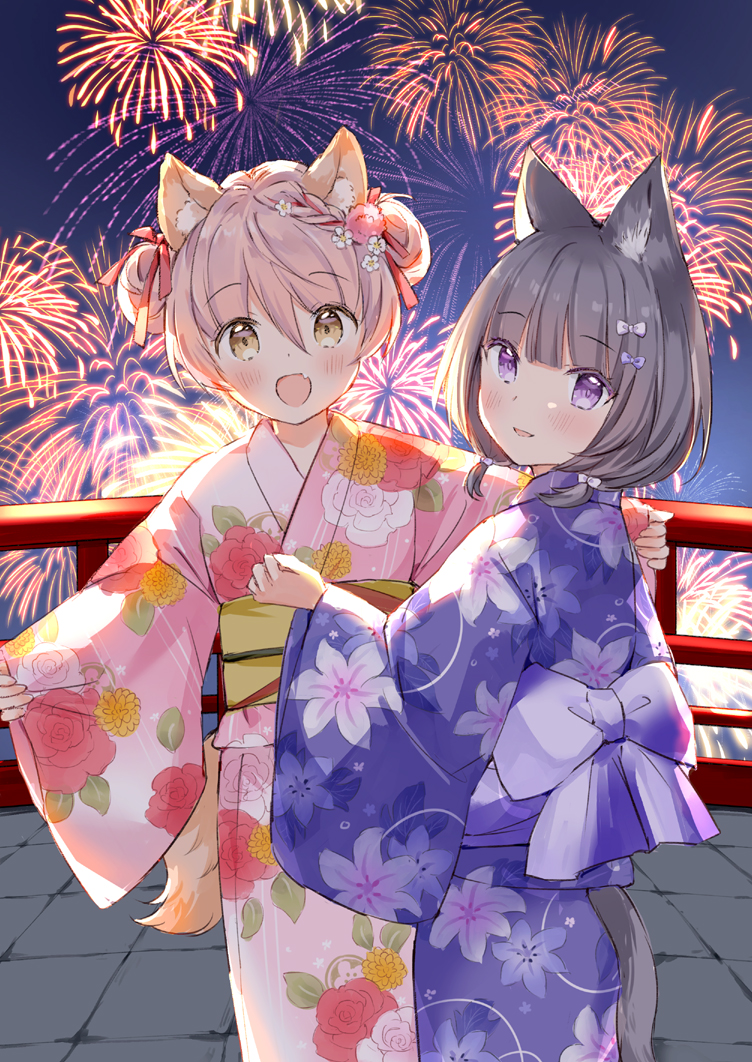 2girls :d aerial_fireworks animal_ear_fluff animal_ears black_hair bow braid brown_eyes commentary_request double_bun fang fireworks floral_print flower hair_between_eyes hair_bun hair_flower hair_ornament hair_over_shoulder japanese_clothes kimono komugi_(wataame27) long_sleeves low_twintails multiple_girls night obi open_mouth original pinching_sleeves pink_flower pink_hair pink_kimono print_kimono purple_bow purple_eyes purple_kimono railing sash sky sleeves_past_wrists smile standing tail twintails wataame27 white_bow white_flower wide_sleeves wolf-chan_(wataame27) wolf_ears wolf_girl wolf_tail