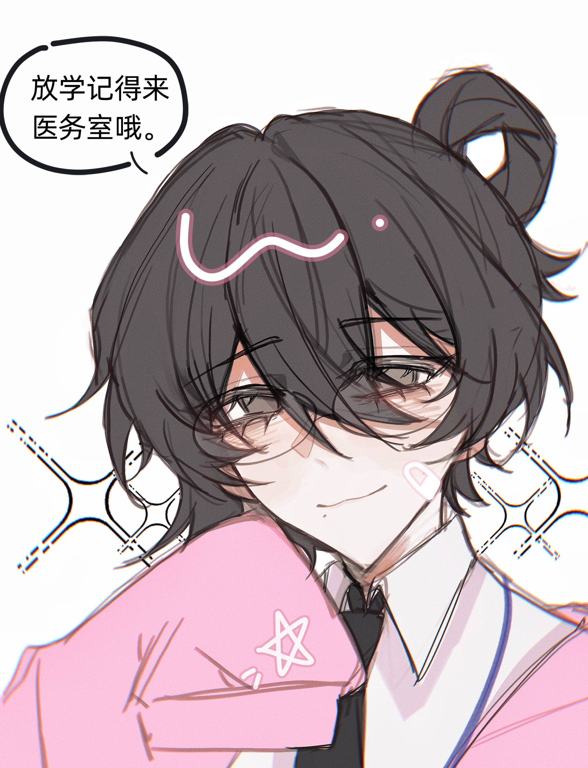 1boy :3 absurdres alternate_hairstyle bespectacled black_eyes black_hair black_necktie chinese_text collared_shirt commentary_request glasses hair_between_eyes hair_rings hand_up highres jacket long_sleeves male_focus mo_chengwei mole mole_under_mouth necktie pink_jacket portrait shirt short_hair single_hair_ring sleeves_past_fingers sleeves_past_wrists solo star_(symbol) touqi_guaitan translation_request white_background white_shirt zhiyelin1212