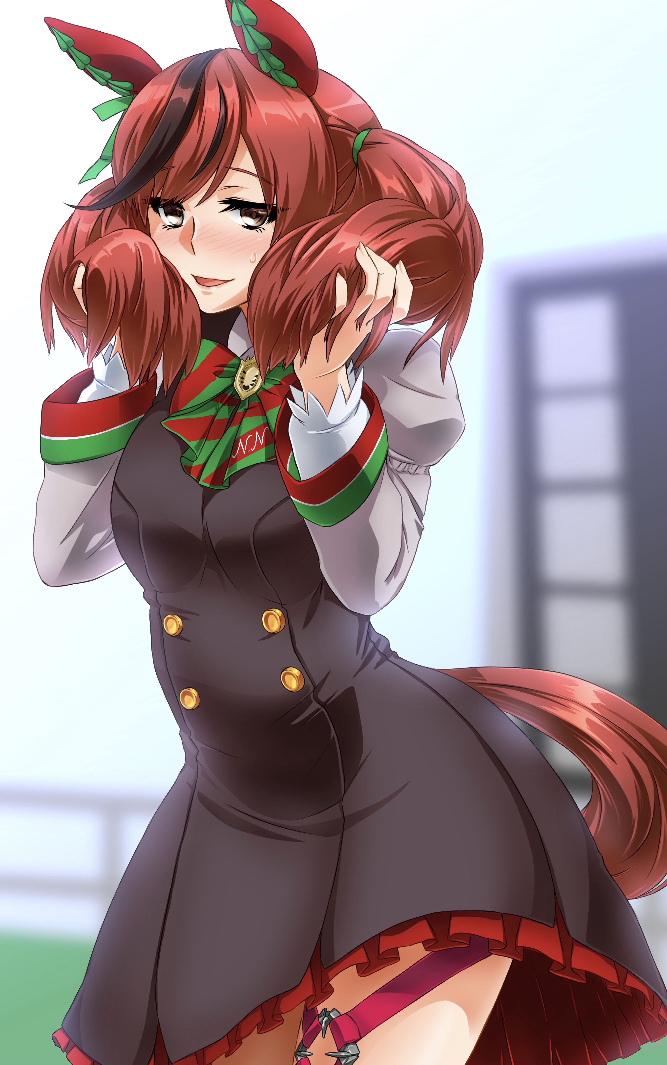 1girl absurdres akito_(sub707) animal_ears blurry blurry_background blush breasts brown_eyes commentary_request ear_covers fluffy hair_between_eyes hair_ornament highres horse_girl medium_breasts medium_hair nice_nature_(umamusume) open_mouth red_hair ribbon short_twintails sky solo sweat twintails umamusume