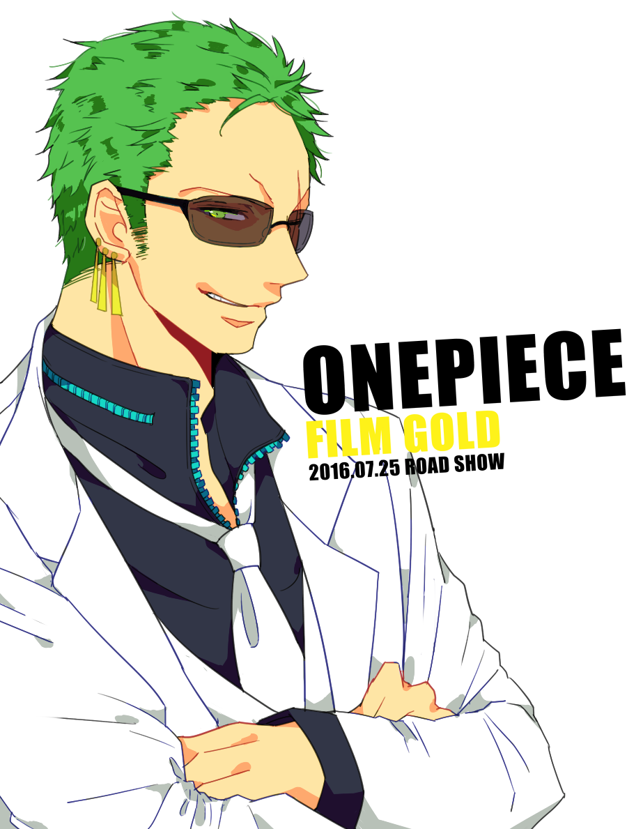 1boy crossed_arms dated earrings green_eyes green_hair grin jewelry long_sleeves looking_at_viewer male_focus mogami_(uduki0422) necktie one_piece one_piece_film:_gold roronoa_zoro sideburns simple_background smile solo sunglasses tinted_eyewear upper_body white_background white_necktie