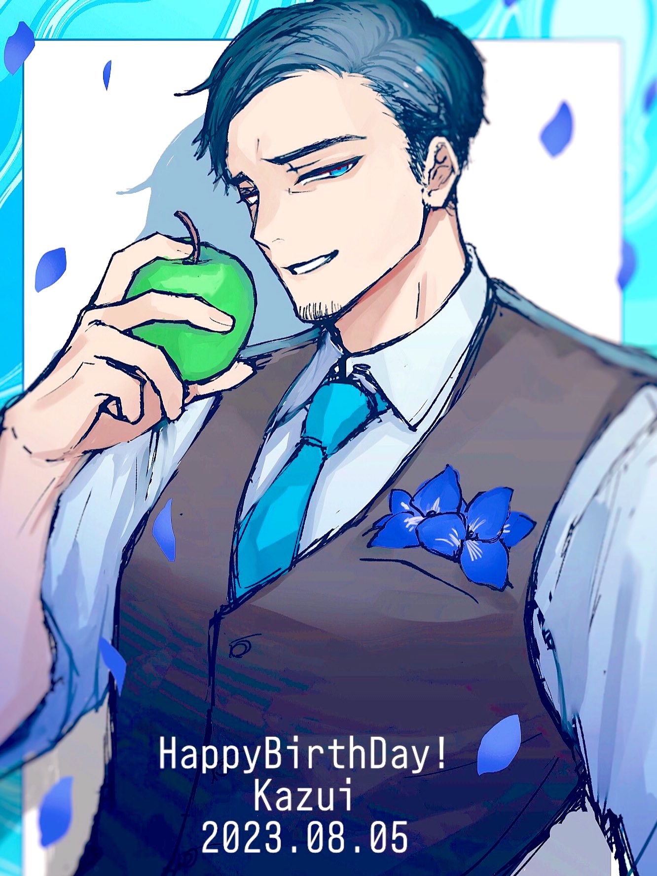0pat0_0 1boy apple black_hair blue_border blue_eyes blue_flower blue_necktie border boutonniere collared_shirt commentary_request facial_hair falling_petals flower food formal_clothes fruit grey_vest grin happy_birthday highres holding holding_food holding_fruit looking_at_viewer male_focus milgram mukuhara_kazui necktie official_alternate_costume outside_border parted_hair petals shirt short_hair smile solo stubble upper_body very_short_hair vest white_background