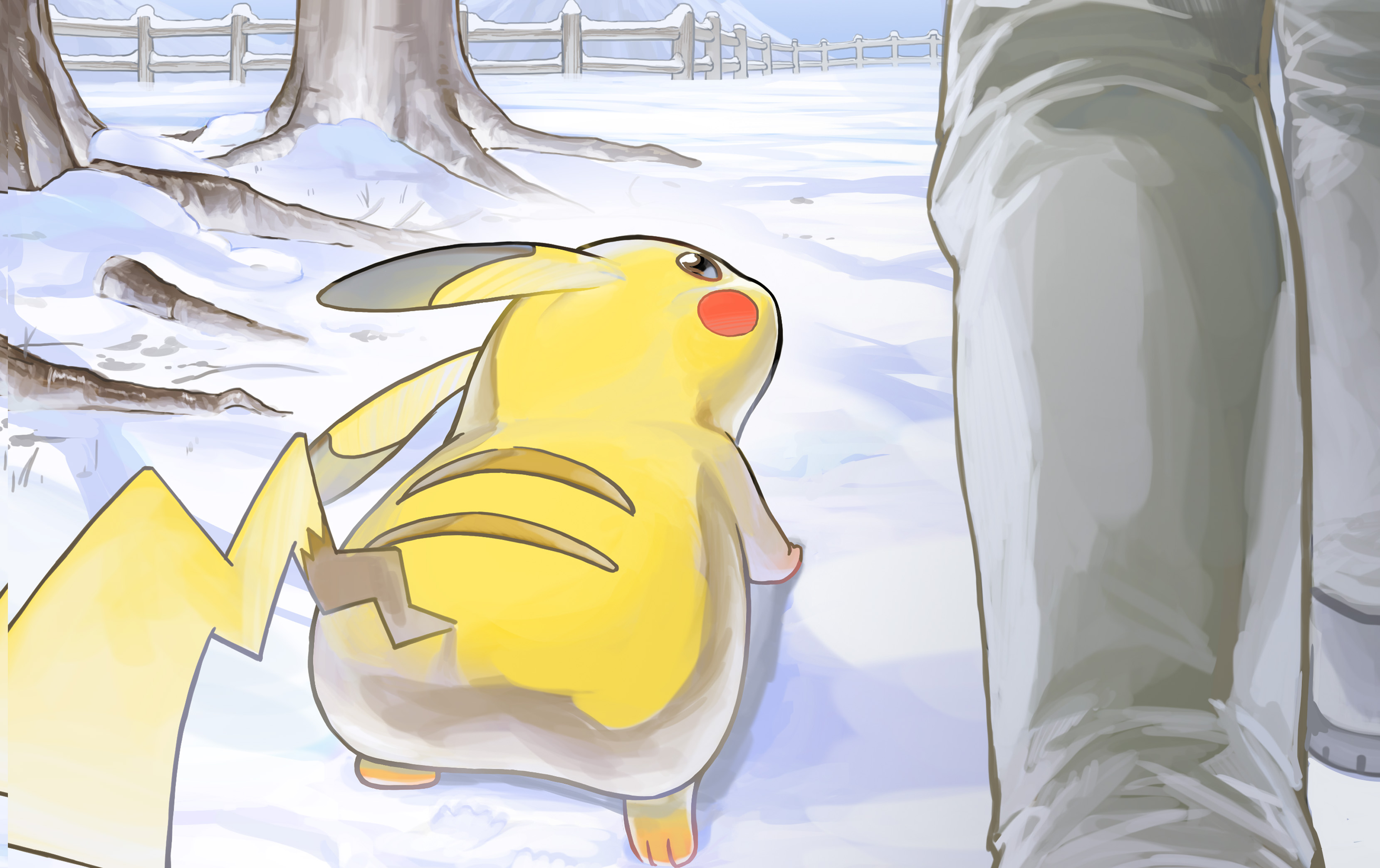 1other absurdres black_eyes commentary_request day fence from_behind gen_1_pokemon grey_footwear grey_pants highres looking_up nintendo outdoors pants pikachu pokemon pokemon_(creature) shoes snow standing sukehachi tree