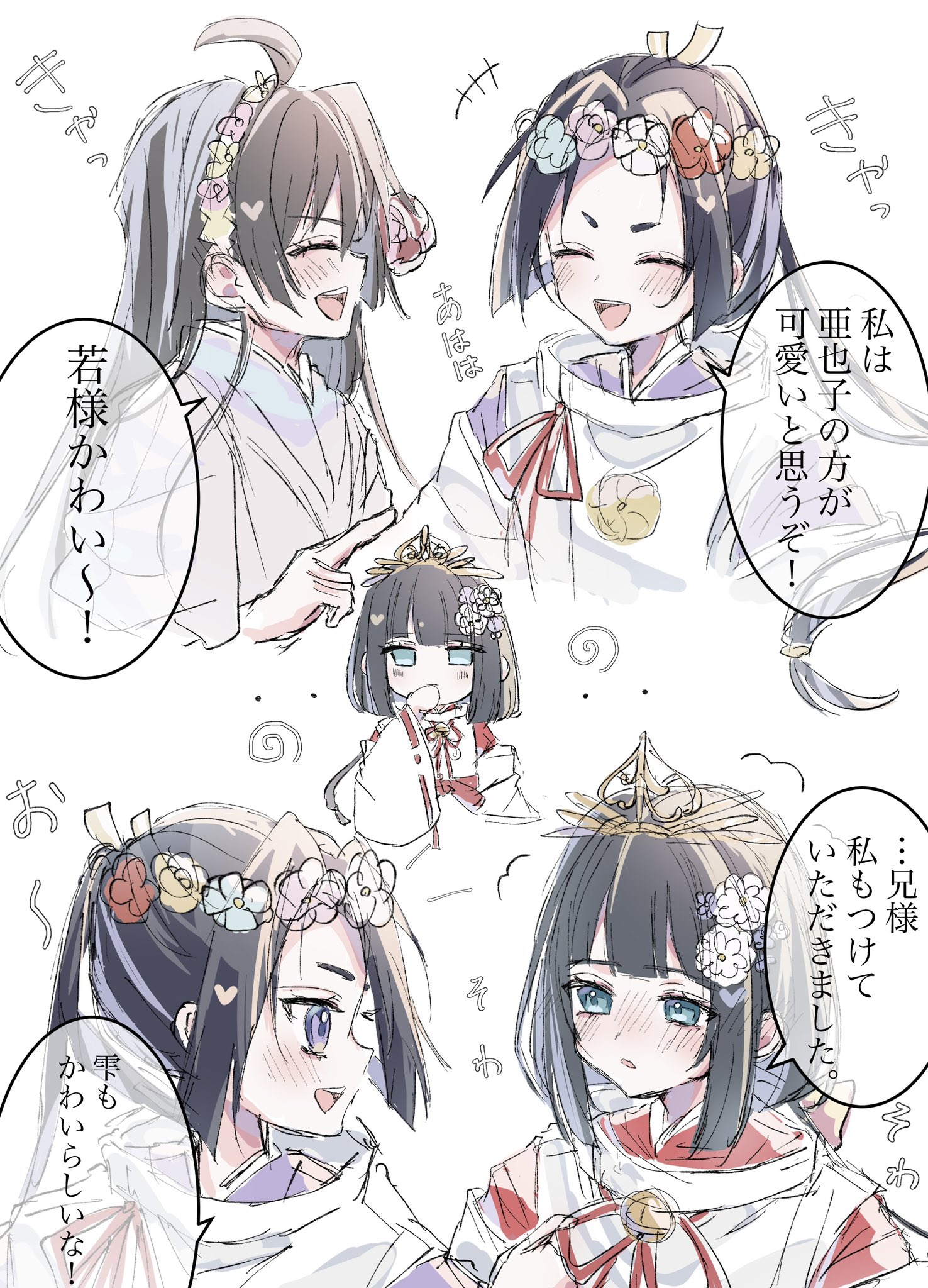 1boy 2girls ahoge black_hair blunt_bangs blunt_sidelocks blush green_eyes hair_ornament hair_ribbon highres hime_cut houjou_tokiyuki_(nige_jouzu_no_wakagimi) japanese_clothes kariginu kimono long_hair long_sleeves low_ponytail miko mochizuki_ayako multiple_girls nige_jouzu_no_wakagimi open_mouth parted_bangs ponytail purple_eyes ribbon roldrum shizuku_(nige_jouzu_no_wakagimi) sidelocks sidelocks_tied_back simple_background smile speech_bubble very_long_hair white_background wide_sleeves