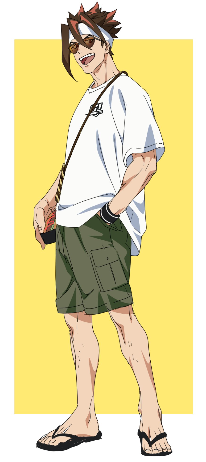 1boy :d anton_ivanov bag black_sandals border brown-tinted_eyewear brown_hair commentary_request feet flip-flops food full_body green_shorts hand_in_pocket headband highres holding holding_food hot_dog kayoko_(panchlora) looking_at_viewer male_focus multicolored_hair open_mouth outside_border red_hair sandals scar scar_on_foot shirt short_hair short_sleeves shorts shoulder_bag simple_background smile solo spiked_hair standing streaked_hair sunglasses t-shirt teeth tinted_eyewear toes v-shaped_eyebrows white_border white_headband white_shirt wristband yellow_background zenless_zone_zero
