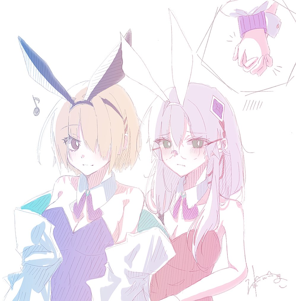 2girls animal_ears blonde_hair blush breasts glasses green_eyes grey_hair hair_ornament hair_over_one_eye hair_over_shoulder heaven_burns_red holding_hands izumi_yuki kayamori_ruka long_hair low-tied_long_hair match_neco multiple_girls one_eye_covered playboy_bunny rabbit_ears red_eyes round_eyewear short_hair yuri