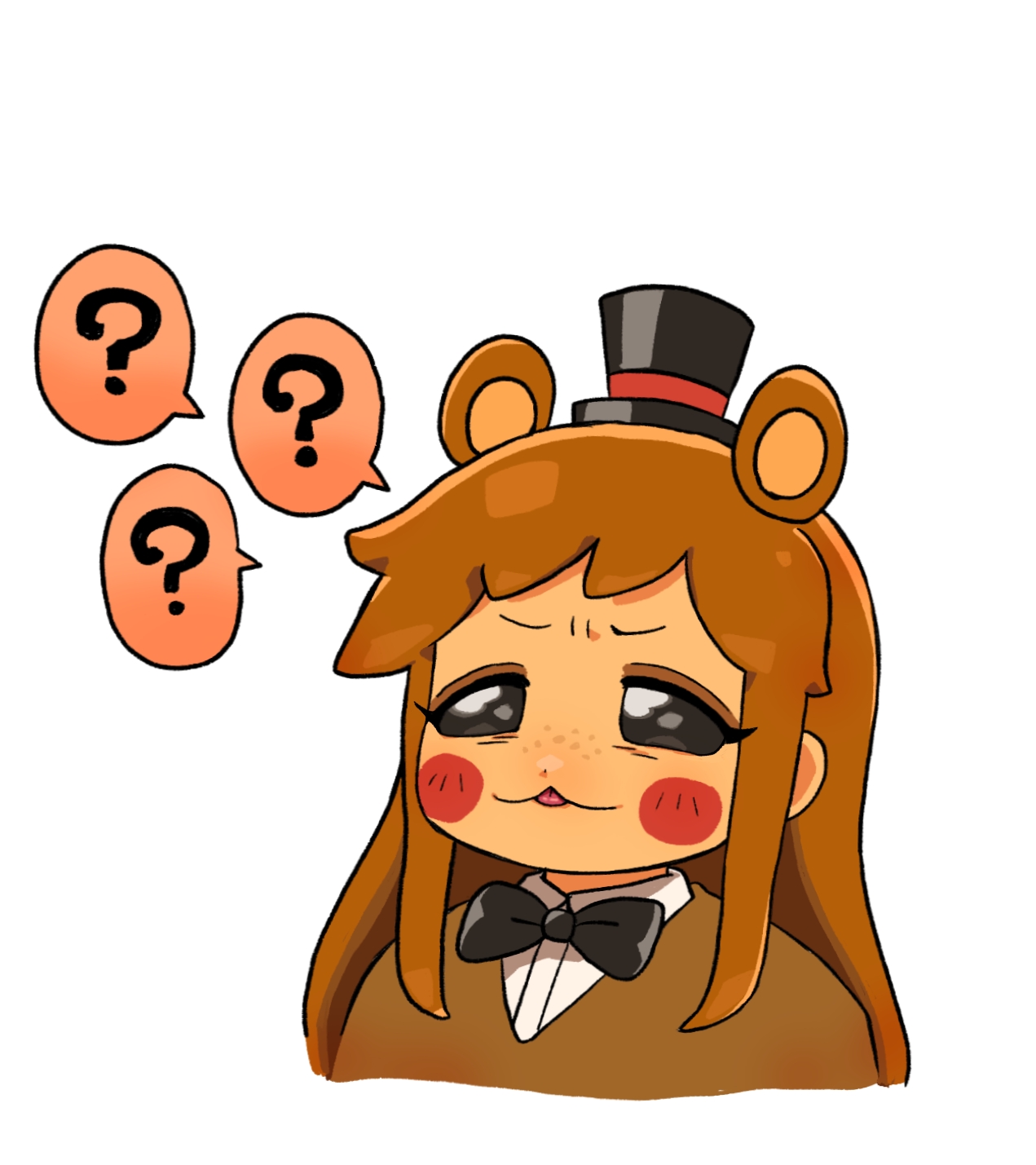 1girl :3 ? animal_ears bear_ears bear_girl blush_stickers bow bowtie brown_hair commentary_request confused dark-skinned_female dark_skin extra_ears five_nights_at_freddy's five_nights_at_freddy's_2 freckles genderswap genderswap_(mtf) hat highres humanization long_hair minami_(mnm-kyk) solo tongue tongue_out top_hat toy_freddy upper_body white_background