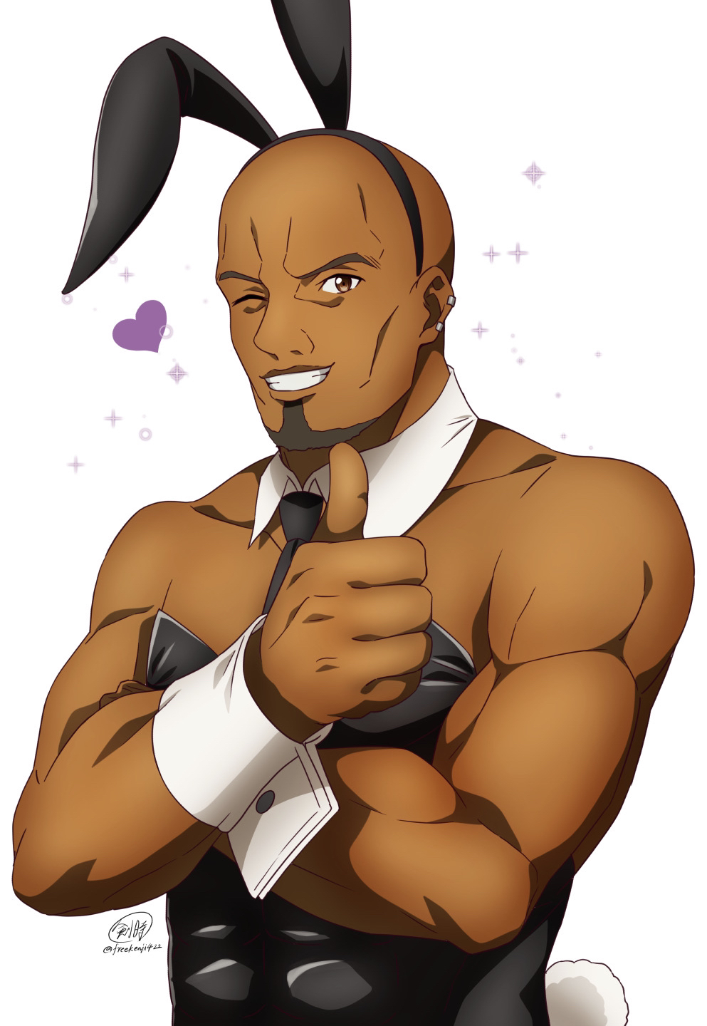 1boy agil animal_ears bald beard black_leotard black_necktie brown_eyes chinstrap_beard commentary_request crossed_arms dark-skinned_male dark_skin detached_collar ear_piercing fake_animal_ears grin heart highres ken-ji leotard looking_at_viewer male_focus male_playboy_bunny muscular muscular_male necktie one_eye_closed piercing rabbit_ears signature simple_background smile solo sparkle strapless strapless_leotard sword_art_online thumbs_up twitter_username white_background white_wrist_cuffs wing_collar wrist_cuffs