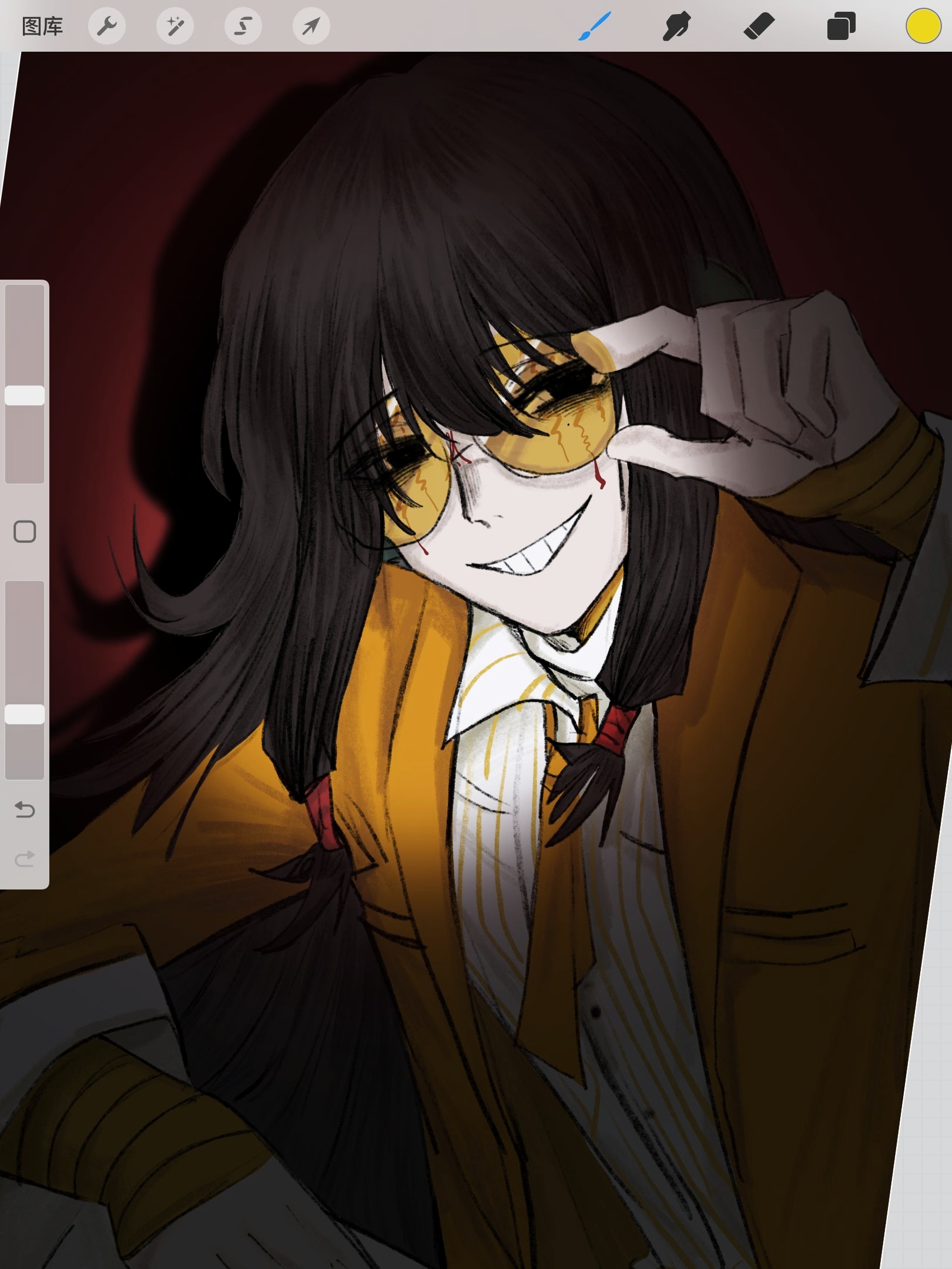 1boy adjusting_eyewear art_program_in_frame black_eyes black_hair collared_shirt facial_tattoo grin hair_between_eyes highres jacket long_hair long_sleeves looking_at_viewer low-tied_sidelocks luguo_de_monu male_focus necktie open_clothes open_jacket procreate_(medium) procreate_(software) red_background round_eyewear shirt sidelocks smile solo striped_clothes striped_shirt tattoo tinted_eyewear touqi_guaitan upper_body vertical-striped_clothes vertical-striped_shirt white_shirt yellow-tinted_eyewear yellow_jacket yellow_necktie ziche_fuzhao