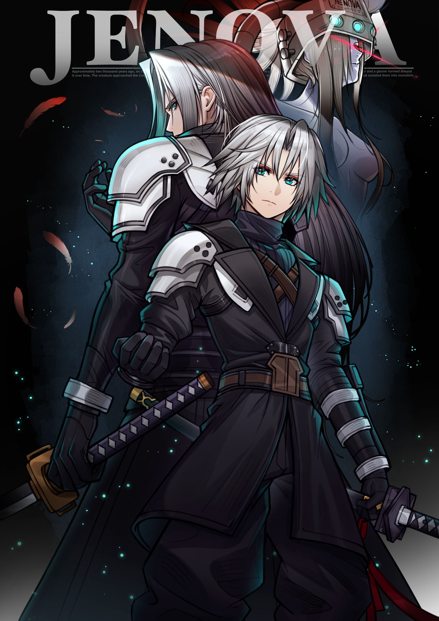 1girl 2boys age_comparison aged_down aqua_eyes armor baggy_pants bangle belt black_background black_coat black_feathers black_footwear black_gloves black_jacket black_pants bracelet breasts brown_belt character_name cleavage closed_mouth coat colored_skin cowboy_shot falling_feathers feathers feet_out_of_frame final_fantasy final_fantasy_vii final_fantasy_vii_rebirth final_fantasy_vii_remake gloves glowing glowing_eyes gradient_background grey_hair grey_skin hair_between_eyes helmet highres holding holding_sword holding_weapon jacket jenova jewelry katana long_coat long_hair long_sleeves lukrevadraws masamune_(ff7) medium_breasts multiple_boys pants parted_bangs red_eyes sephiroth sephiroth_(ever_crisis) short_hair shoulder_armor sword turtleneck underboob weapon