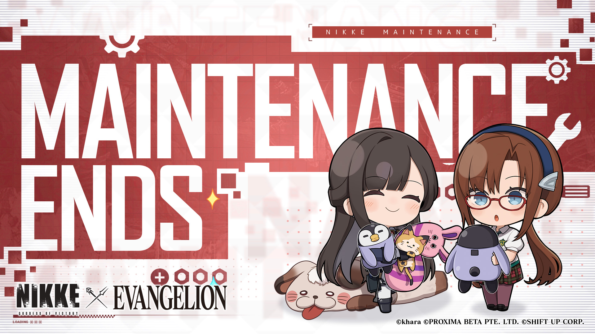 2girls blue_eyes blue_hairband boots brown_hair chibi closed_eyes closed_mouth collared_shirt commentary copyright_name crossover english_commentary english_text full_body glasses goddess_of_victory:_nikke hairband highres holding holding_stuffed_toy loafers long_hair makinami_mari_illustrious marciana_(nikke) multiple_girls neon_genesis_evangelion official_art pants parted_bangs plaid_clothes plaid_skirt puffy_short_sleeves puffy_sleeves rebuild_of_evangelion red-framed_eyewear red_skirt shirt shoes short_sleeves skirt smile standing stuffed_animal stuffed_cat stuffed_penguin stuffed_rabbit stuffed_toy totatokeke very_long_hair white_pants white_shirt