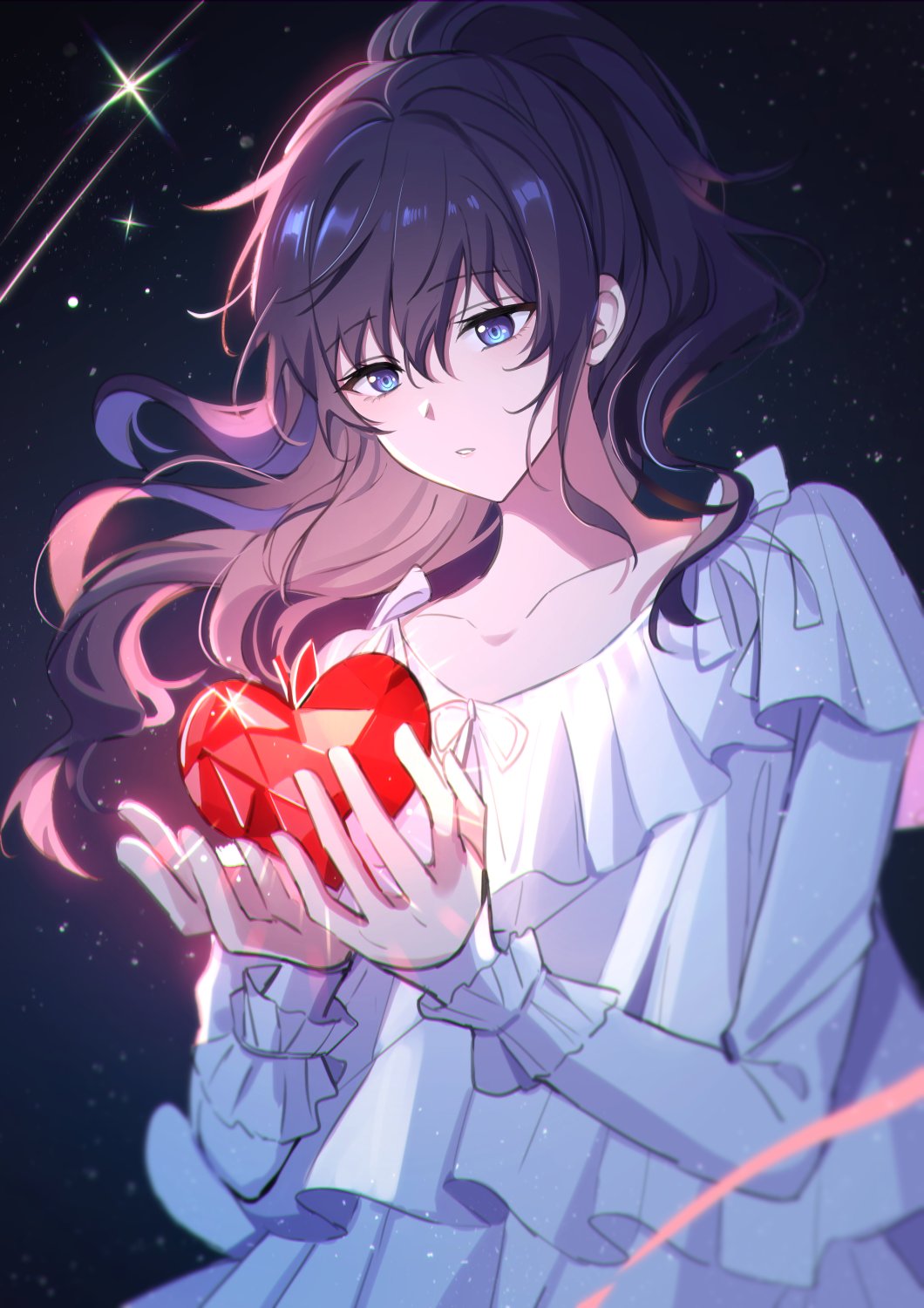 1girl asahina_mafuyu dress frilled_dress frills hair_between_eyes heart high_ponytail highres holding holding_heart long_hair long_sleeves looking_at_object open_mouth ponytail project_sekai purple_eyes purple_hair sakuya_990331 sky solo star_(sky) starry_sky upper_body white_dress
