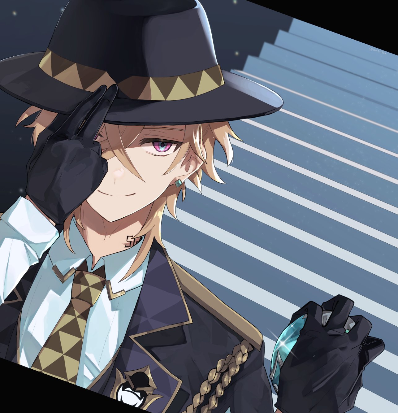 1boy amachi_(yuuin) aventurine_(honkai:_star_rail) aventurine_(stoneheart's_oath_ring)_(honkai:_star_rail) black_border black_gloves black_hair blonde_hair blue_eyes border collared_shirt earrings gloves gold_trim hair_between_eyes hat_tip highres holding holding_jewelry honkai:_star_rail honkai_(series) jewelry long_sleeves looking_at_viewer male_focus multicolored_eyes neck_tattoo necktie one_eye_covered pink_eyes shirt short_hair smile solo stairs tattoo upper_body white_shirt yellow_necktie