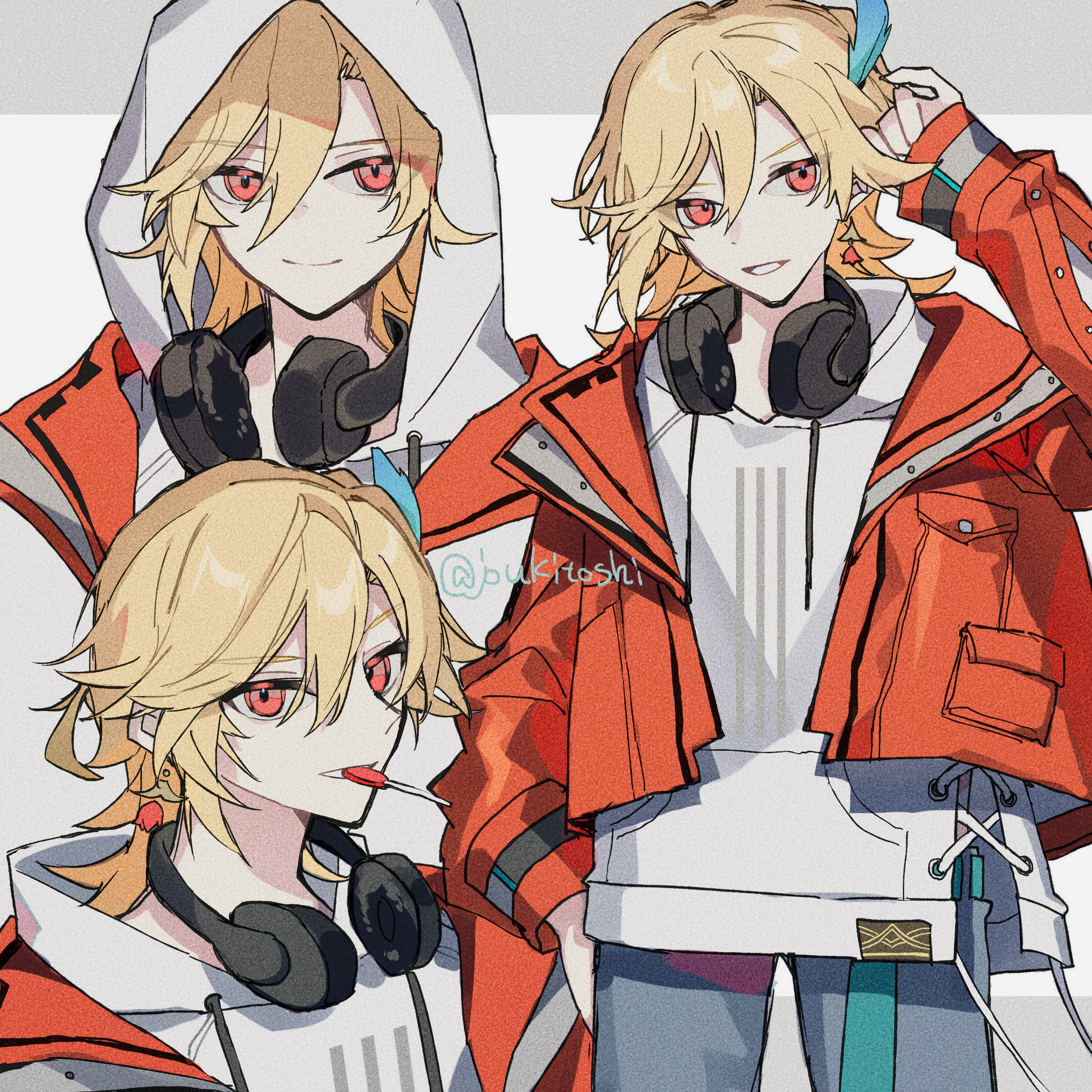 1boy blonde_hair blue_pants candy casual earrings feather_hair_ornament feathers food genshin_impact hair_between_eyes hair_ornament hand_in_own_hair headphones headphones_around_neck highres hood hood_down hood_up hoodie jacket jewelry kaveh_(genshin_impact) leaf_hair_ornament lollipop long_hair long_sleeves looking_at_viewer male_focus misato_karuha multiple_views open_clothes open_jacket open_mouth pants red_eyes red_jacket simple_background sleeves_past_wrists smile white_hoodie