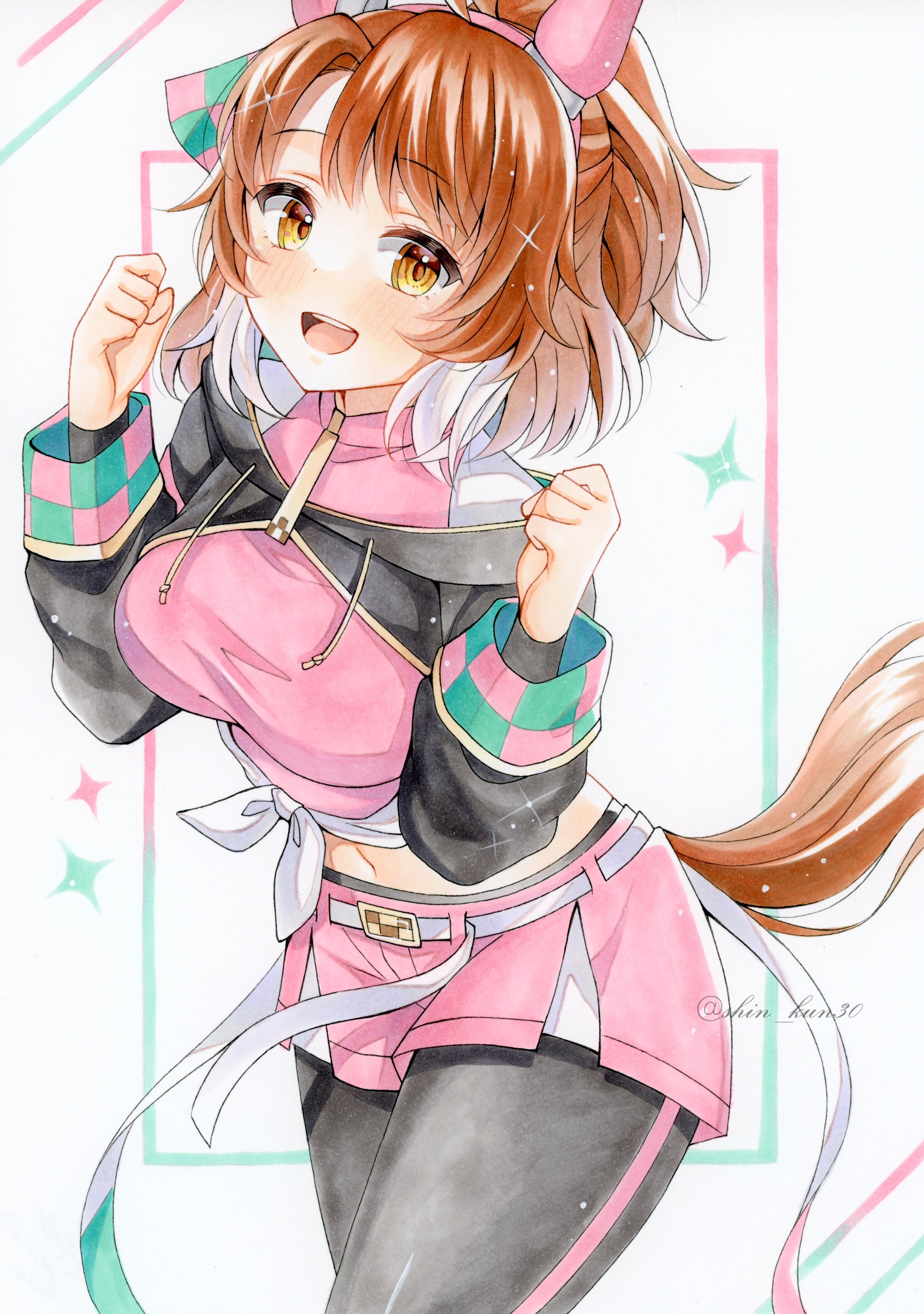 1girl absurdres animal_ears belt blush breasts brown_eyes brown_hair clenched_hands dantsu_flame_(center_spotlight)_(umamusume) dantsu_flame_(umamusume) hair_ornament headband highres horse_ears horse_girl horse_tail looking_at_viewer midriff navel open_mouth pantyhose shin_kun30 shorts simple_background solo tail traditional_media umamusume white_background