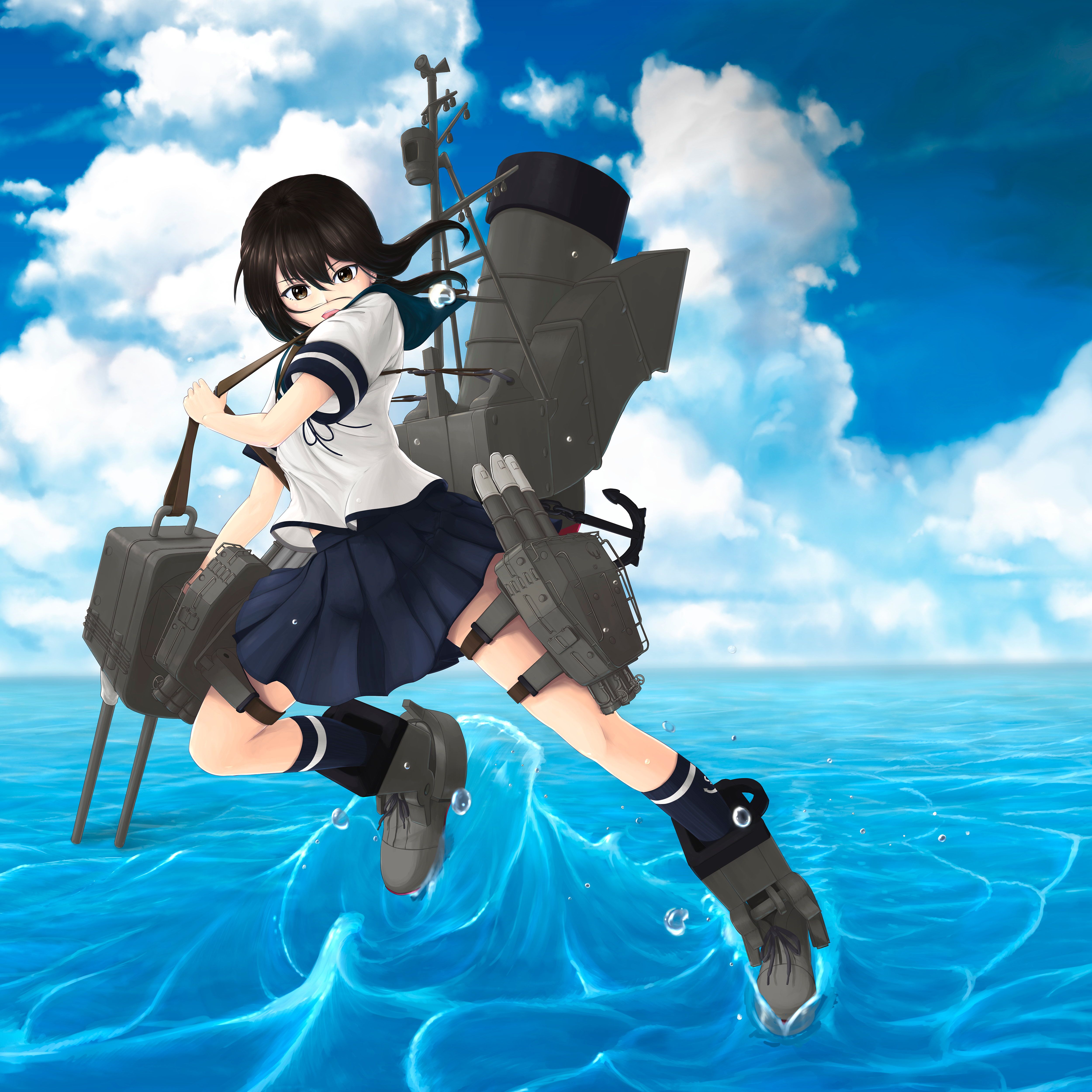 1girl absurdres anchor_symbol black_socks blue_sailor_collar blue_skirt boots brown_eyes brown_hair cloud cloudy_sky commentary_request day fubuki_(kancolle) full_body grey_boots hair_between_eyes highres holding holding_turret kantai_collection kneehighs long_hair looking_at_viewer low_ponytail mast ocean open_mouth outdoors ponytail rigging sailor_collar ship_turret shirt shoelaces short_sleeves sidelocks skirt sky smokestack socks solo standing standing_on_liquid taida_jun teeth thigh_strap torpedo torpedo_launcher turret white_shirt