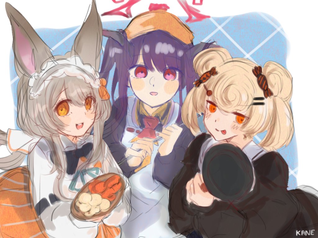3girls :d :p animal_ears apron arknights artist_name black_dress blonde_hair blue_archive blush_stickers closed_mouth dress food frying_pan fuuka_(blue_archive) grey_hair group_picture gummy_(arknights) halo holding holding_food holding_frying_pan horns jacket kanesty long_hair long_sleeves looking_at_viewer multiple_girls open_mouth orange_eyes pink_halo purple_eyes purple_hair ribbon short_hair signature smile tongue tongue_out warmy_(arknights) white_apron