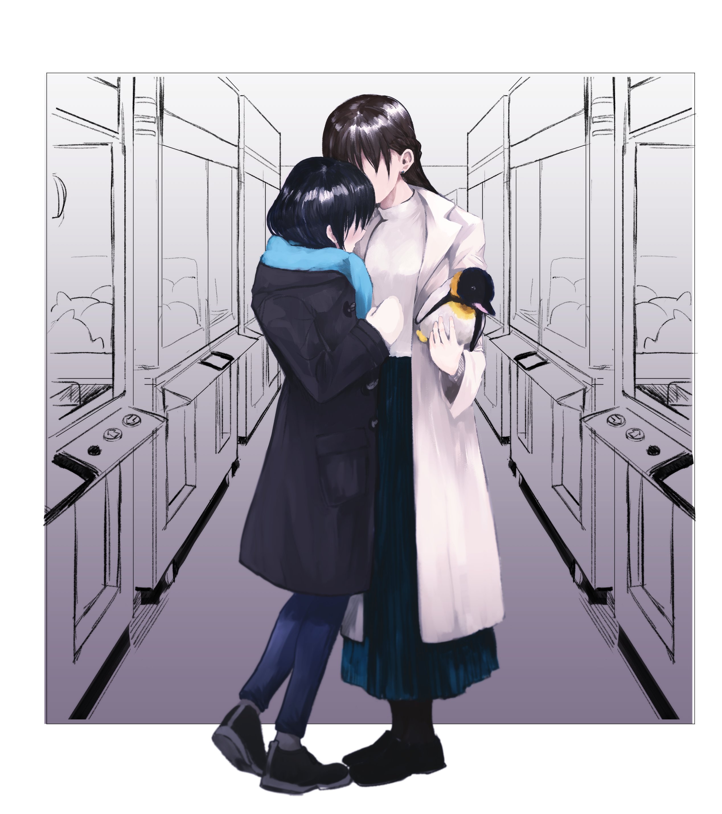 2girls absurdres arcade black_coat black_footwear blue_hair blue_pants blue_scarf blue_skirt blush brown_hair coat commentary_request crane_game highres long_hair lr6fko4upypf9hv mittens miyagi_shiori multiple_girls pants scarf sendai_hazuki shuuniichido_classmate_wo_kau_hanashi skirt standing stuffed_animal stuffed_penguin stuffed_toy sweater turtleneck turtleneck_sweater white_coat white_mittens white_sweater yuri