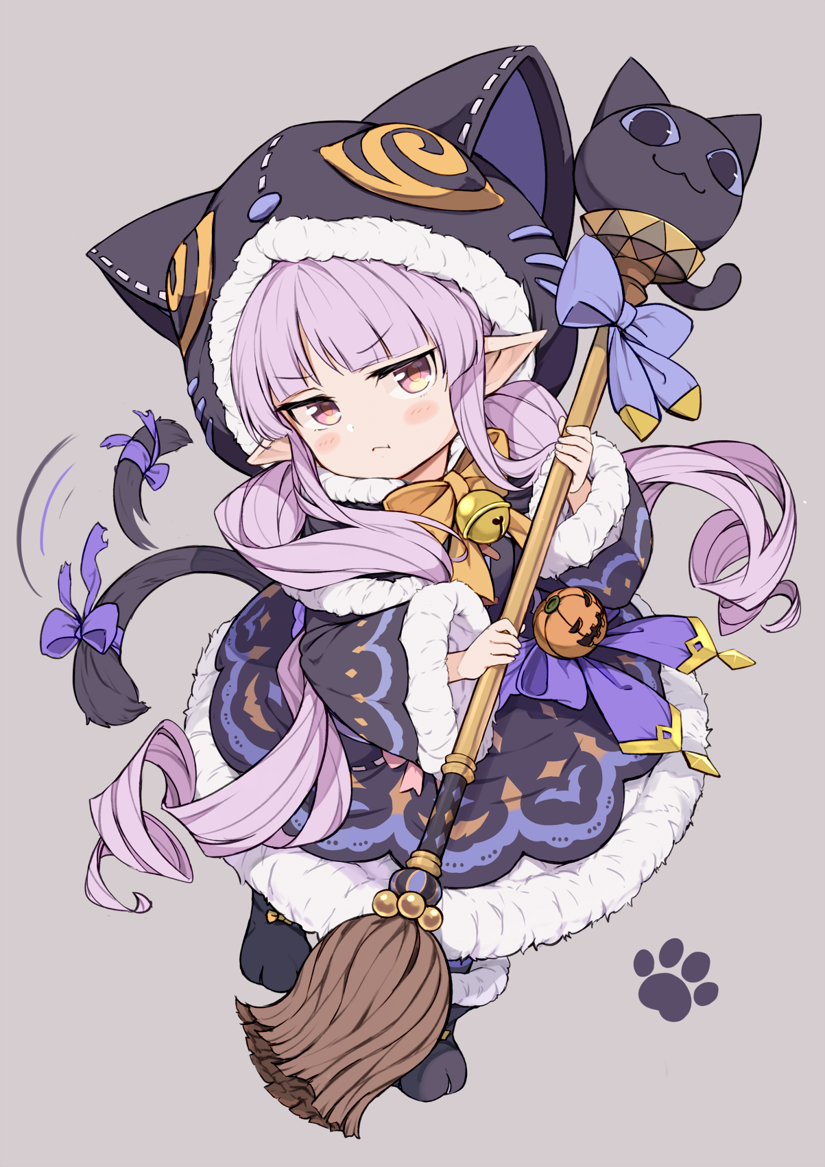 1girl animal_hood black_capelet bow broom capelet cat_hood dress elf fur-trimmed_capelet fur-trimmed_dress fur-trimmed_hood fur-trimmed_skirt fur-trimmed_sleeves fur_trim highres hood hooded_capelet iwao_(pixiv258710) kyoka_(halloween)_(princess_connect!) kyoka_(princess_connect!) pointy_ears princess_connect! purple_hair skirt solo tail tail_bow tail_ornament twintails